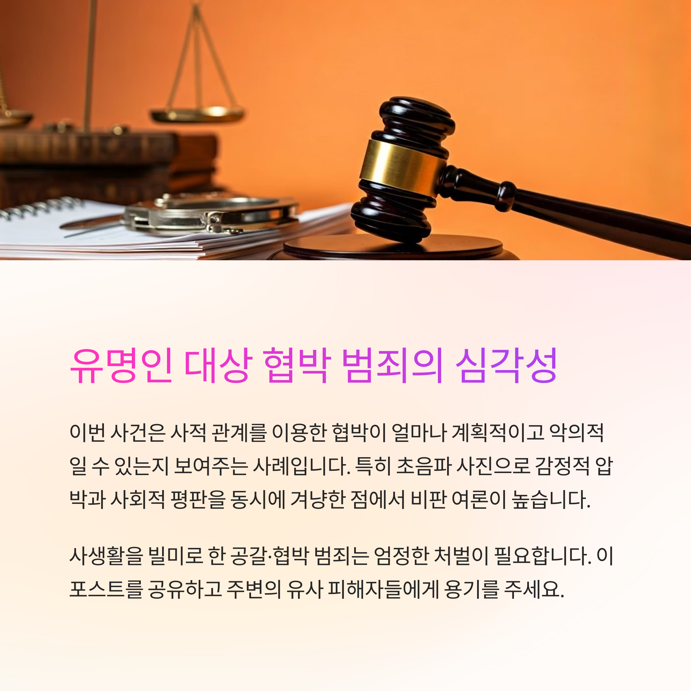 이번 사건은 사적 관계를 이용한 협박 수법이 얼마나 계획적이고 악의적일 수 있는지를 보여주는 대표적 사례입니다.