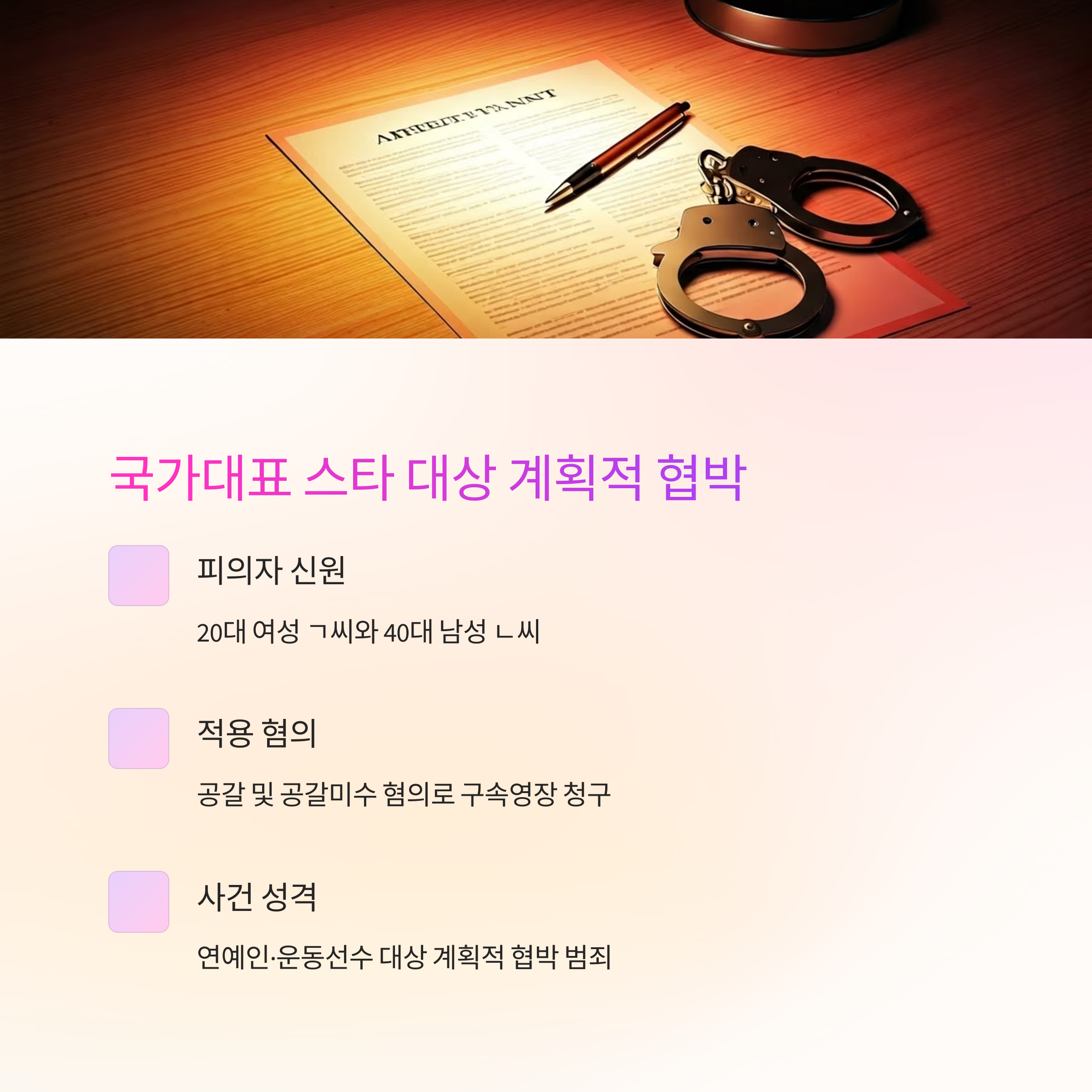 이 사건은 연예인·운동선수를 대상으로 한 계획적 협박 범죄의 전형적인 사례로, 법원은 17일 구속 여부를 결정할 예정입니다.