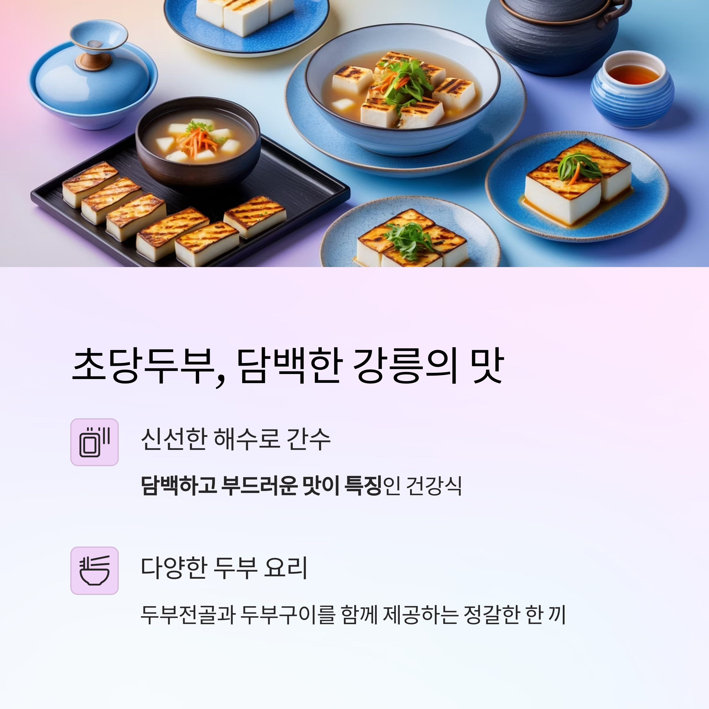 신선한 해수로 간수를 한 초당두부는 담백하고 부드러운 맛이 특징으로