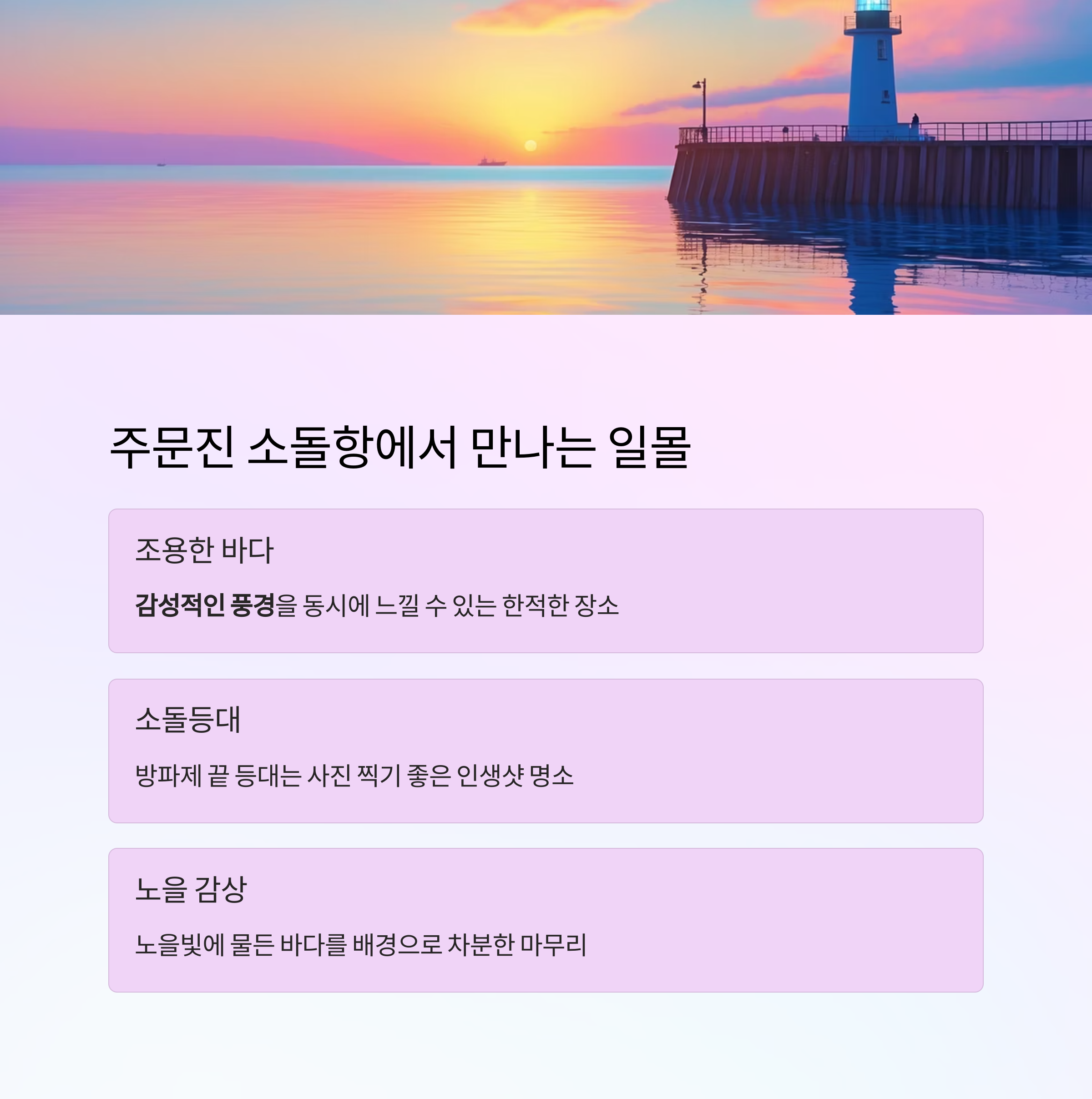 일몰 시간대에는 조용한 바다와 감성적인 풍경을 동시에 느낄 수 있는