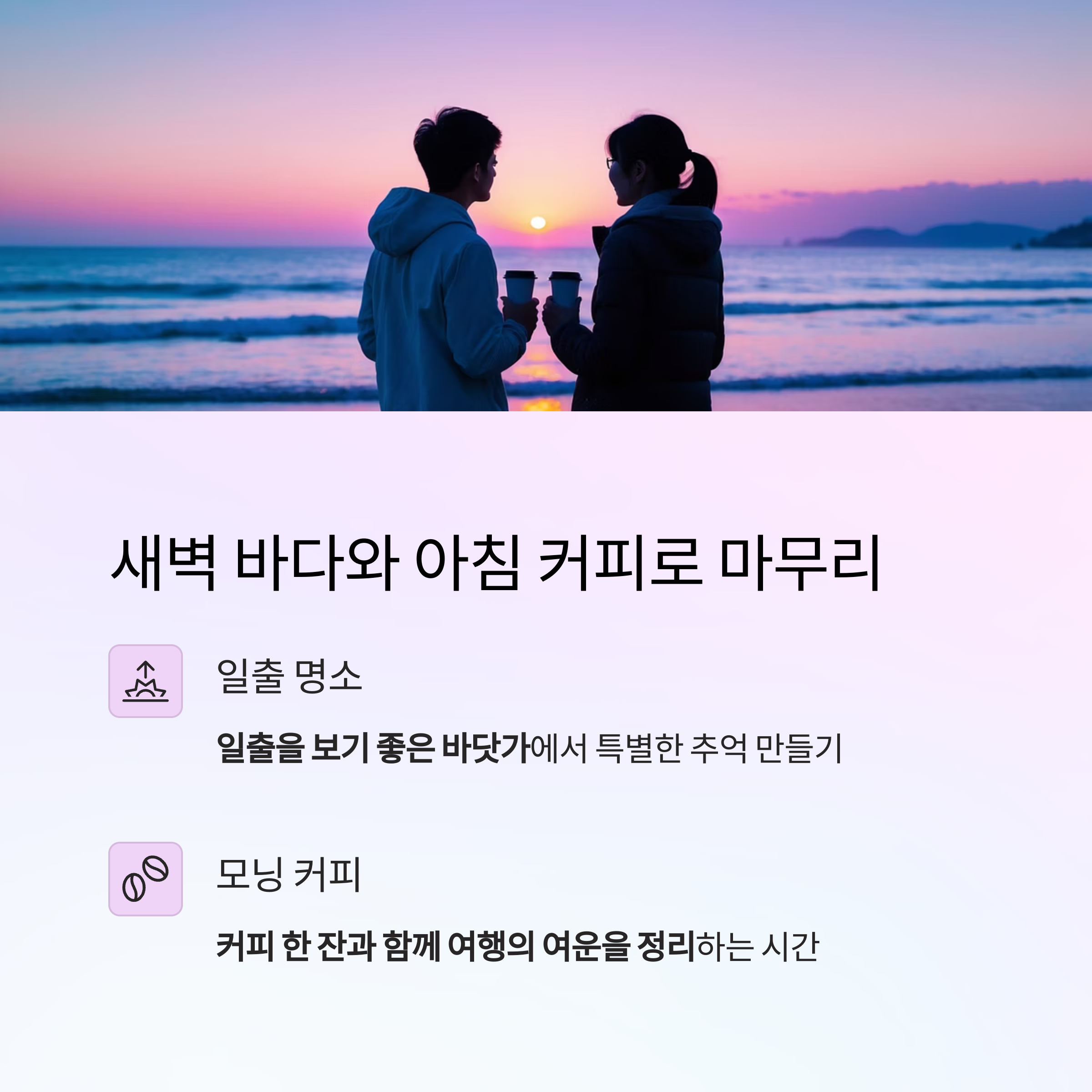 여행의 마지막 날은 일출을 보기 좋은 바닷가에서 시작해보세요.
