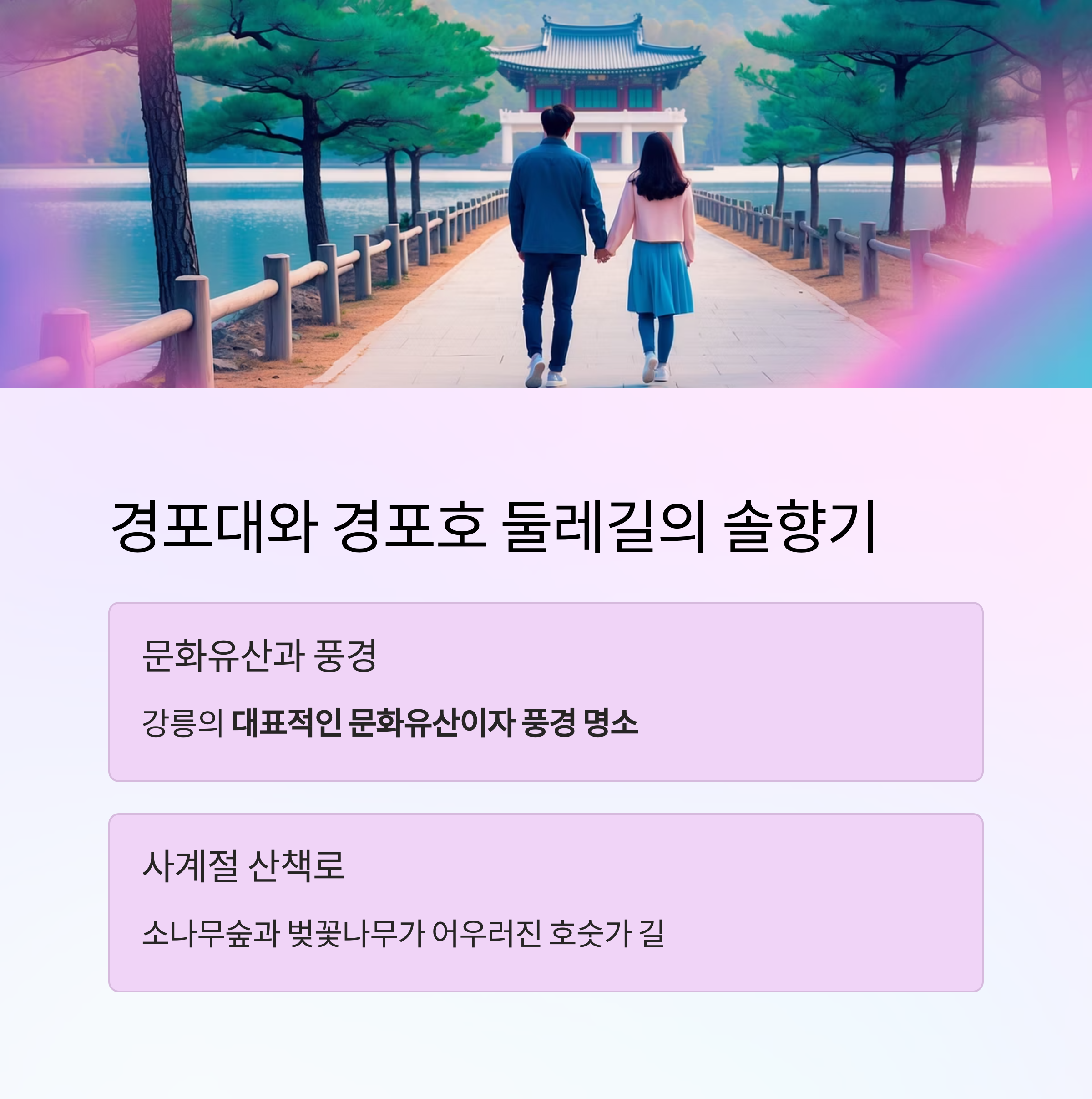 경포호를 따라 이어지는 산책로는 소나무숲과 벚꽃나무가 어우러져 사계절 내내 걷기 좋으며