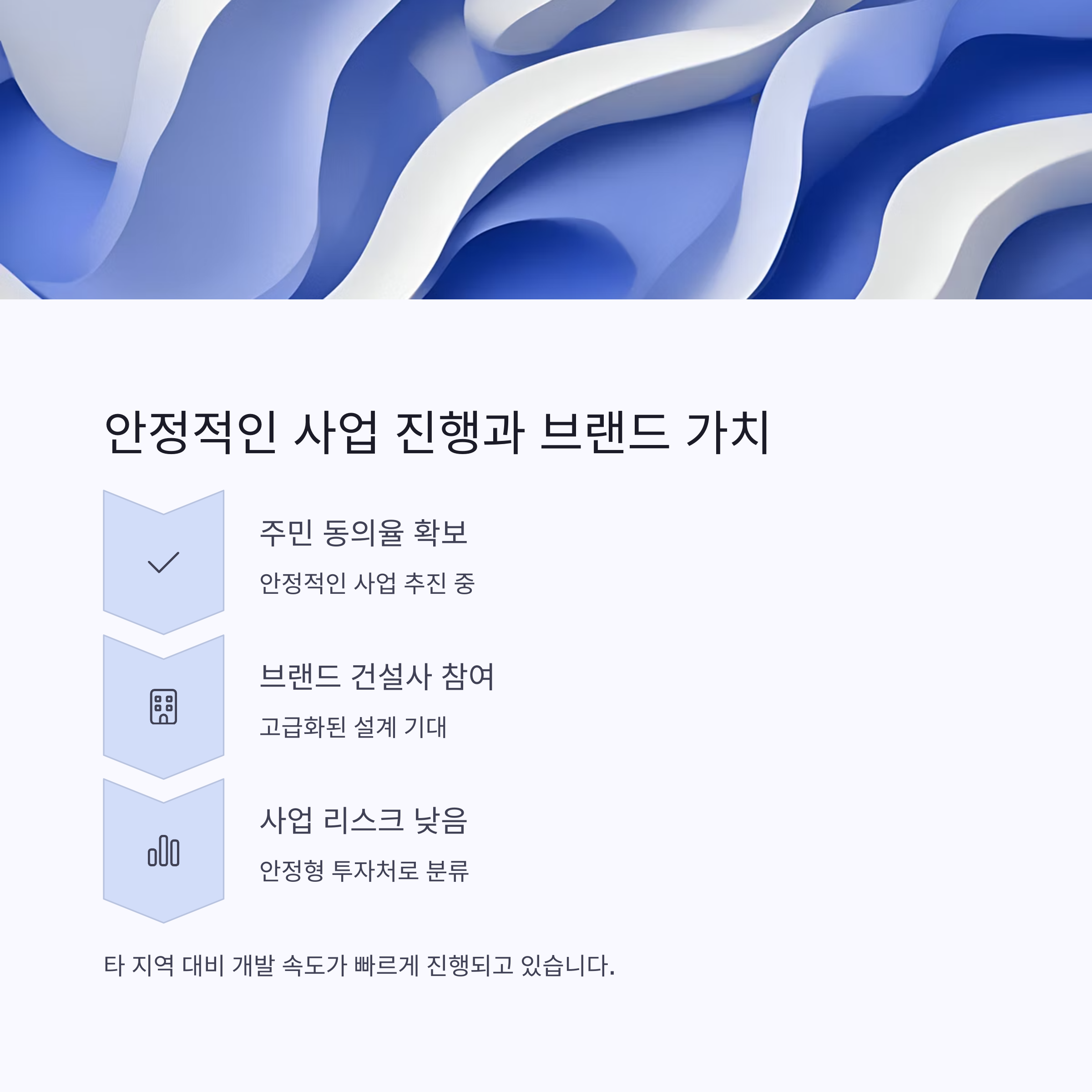 주민 동의율 확보, 조합 설립 및 시공사 선정 절차가 안정적으로 이뤄지고 있습니다.