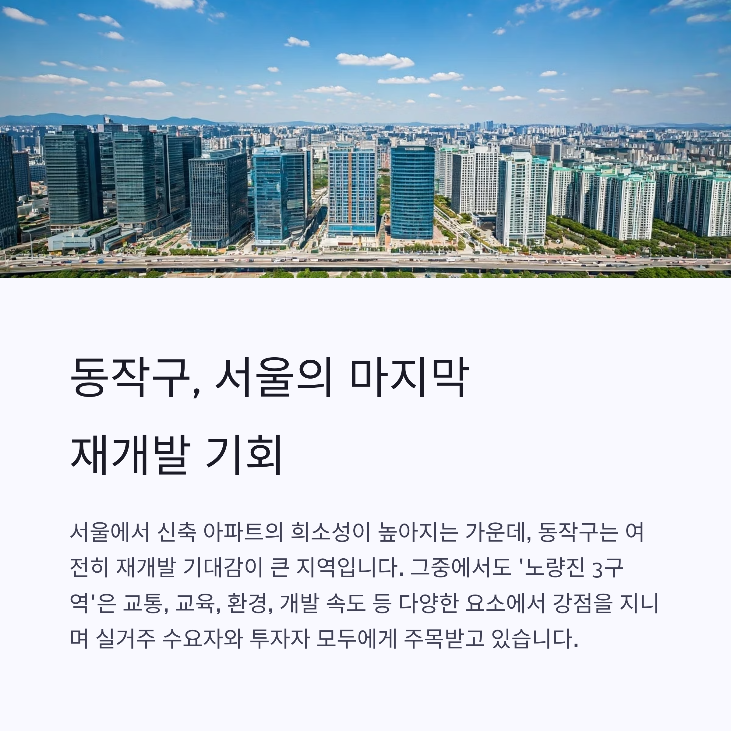 서울에서 신축 아파트의 희소성이 높아지는 가운데, 동작구는 여전히 재개발 기대감이 큰 지역으로 평가받고 있습니다.