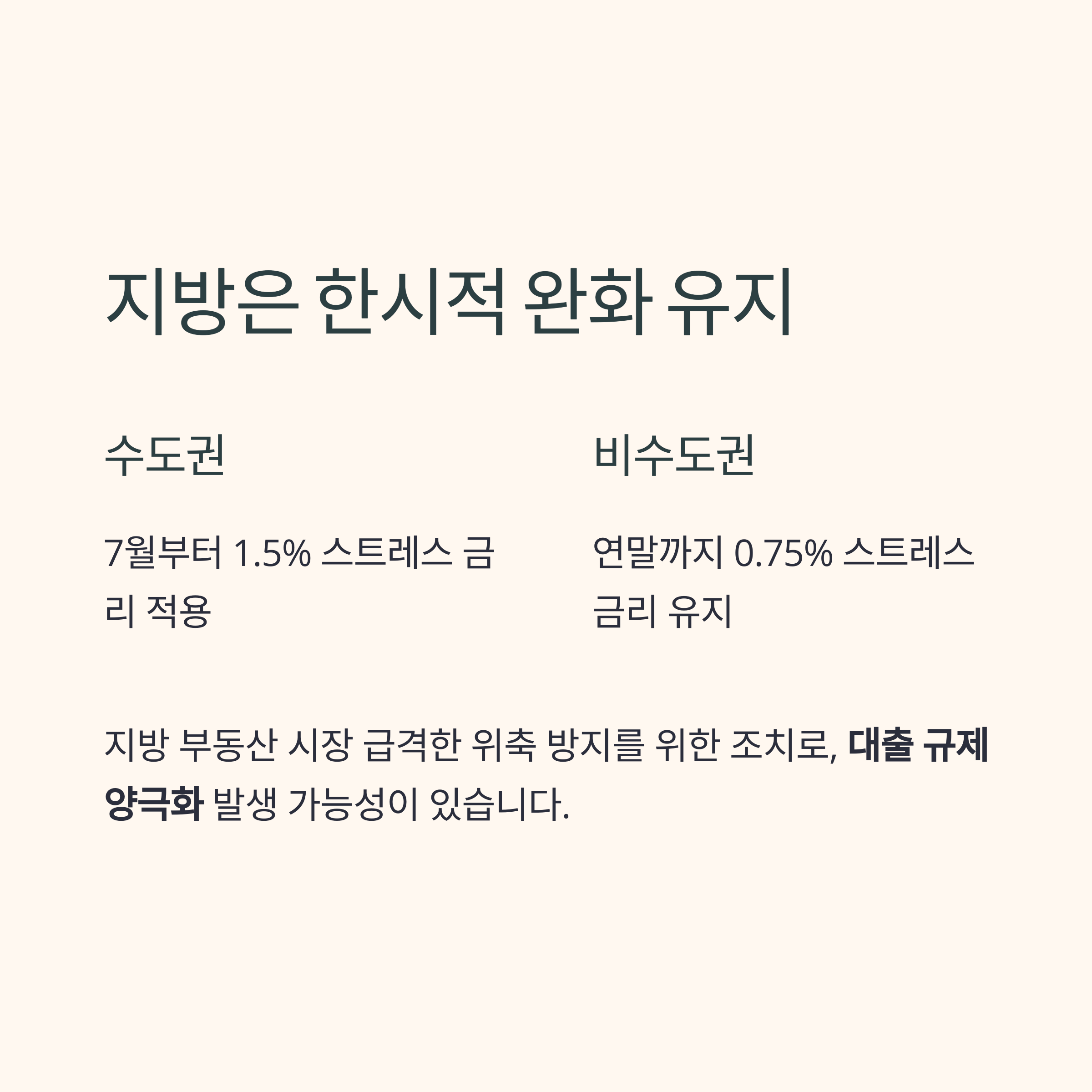 전세 수요 증가나 월세 전환 가속 등 간접적 여파도 주의해야 합니다.