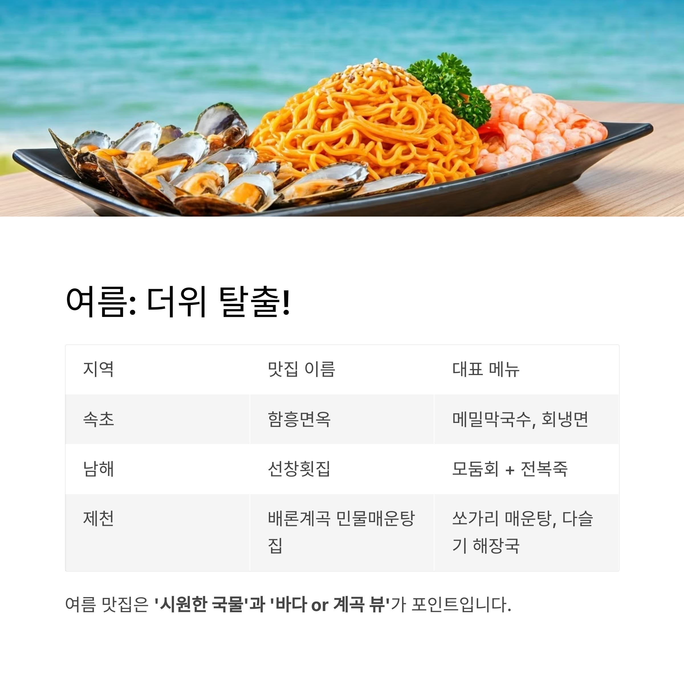 중요: 여름 맛집은 **‘시원한 국물’과 ‘바다 or 계곡 뷰’**가 포인트입니다.