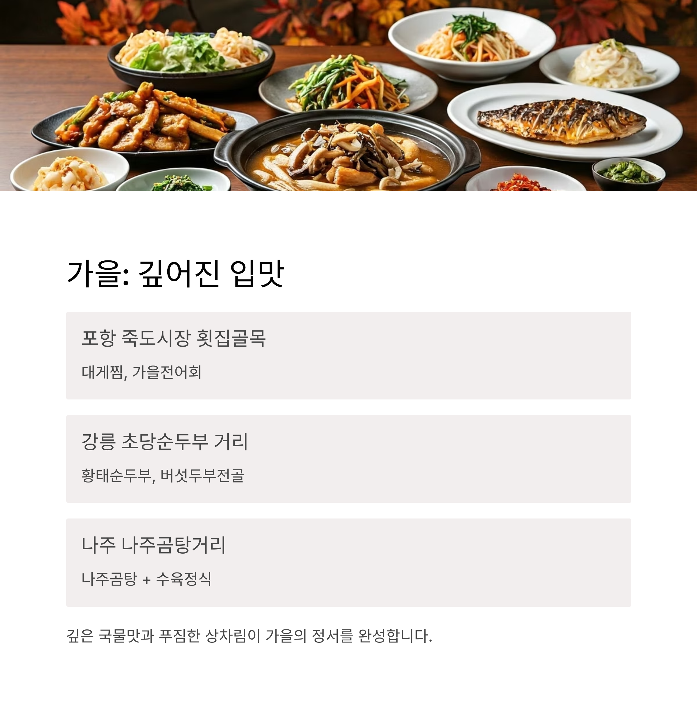 핵심: 깊은 국물맛과 푸짐한 상차림이 가을의 정서를 완성합니다.
