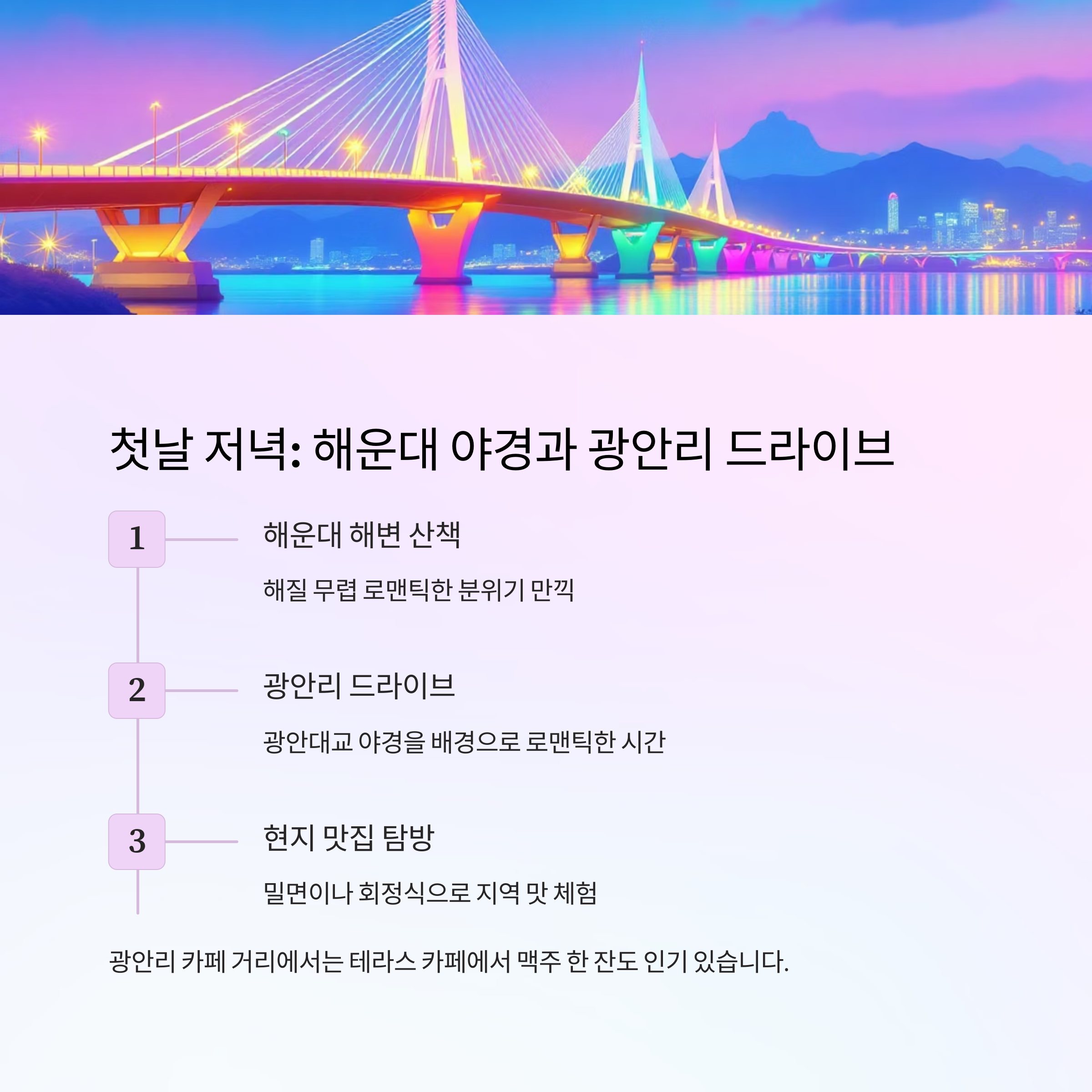 해가 질 무렵 해운대 해변을 산책하고, 저녁엔 광안리까지 드라이브하며