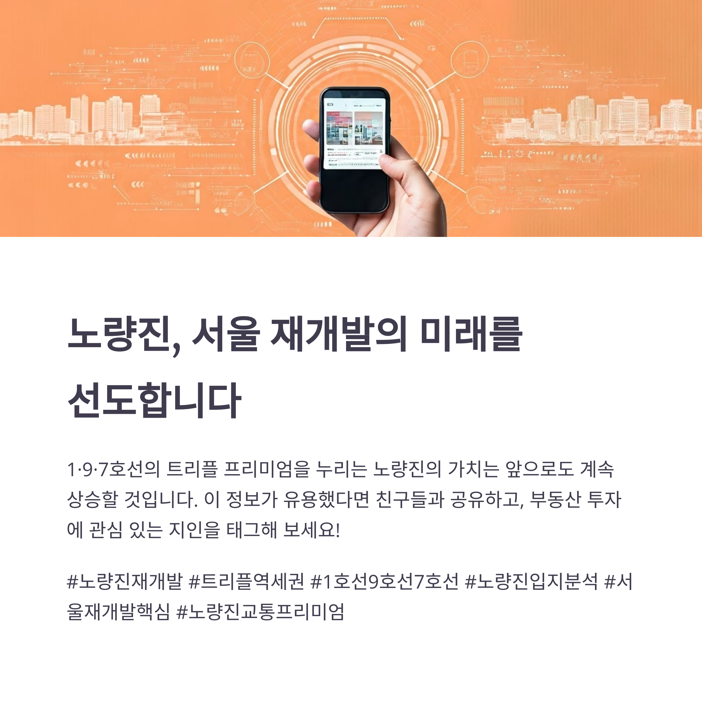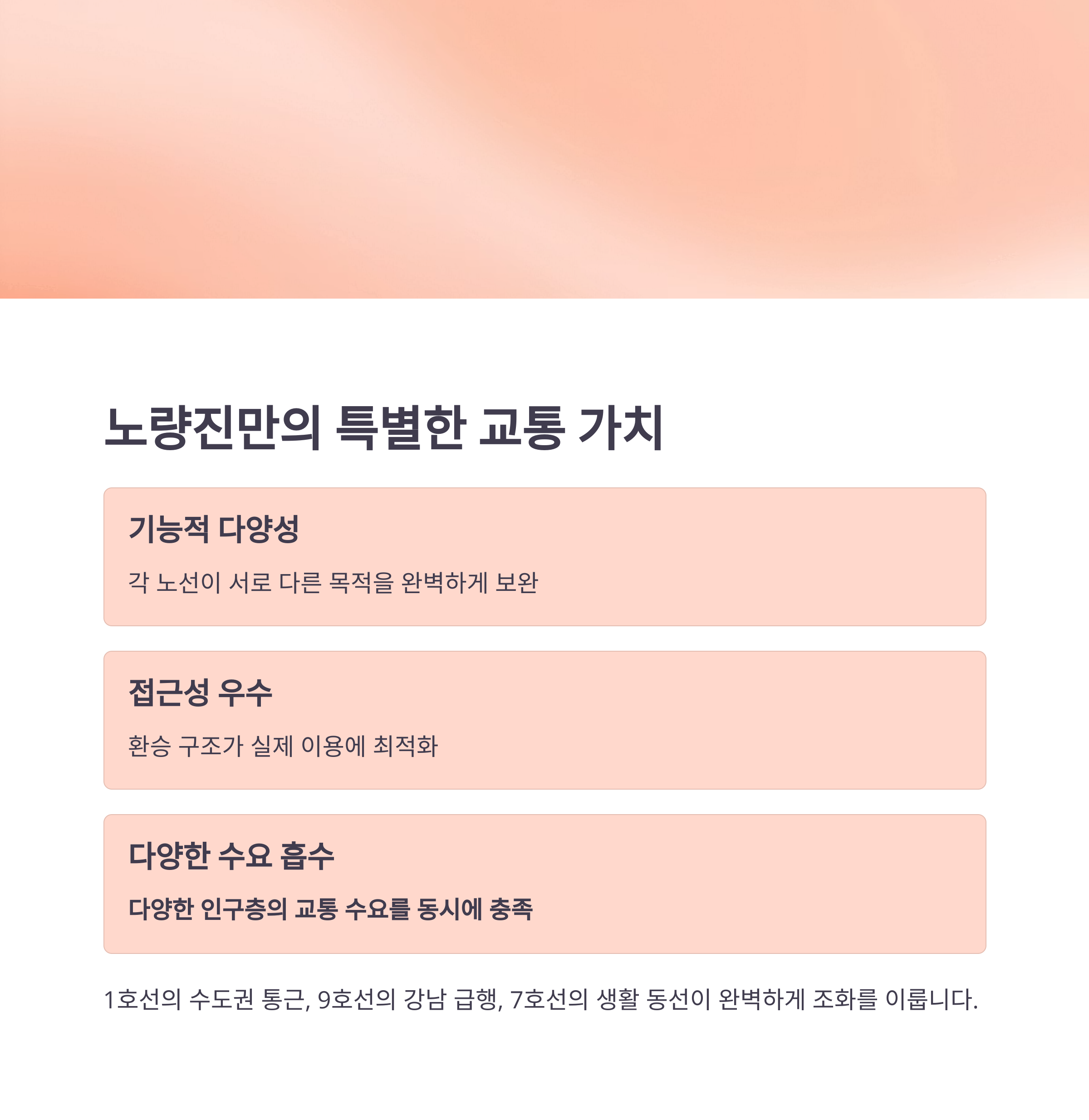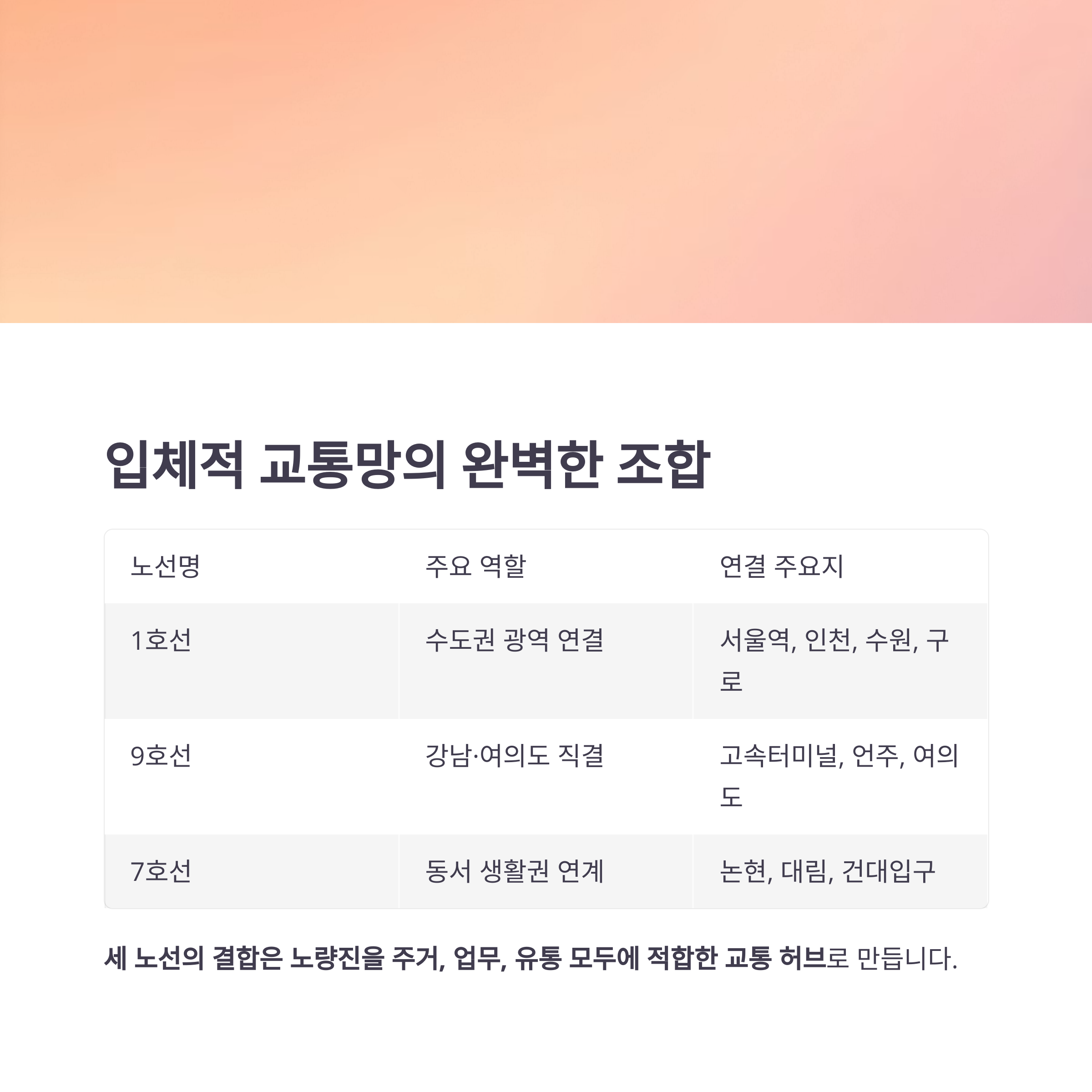 이 세 노선의 결합은 노량진을 주거, 업무, 유통 모두에 적합한 교통 허브로 만듭니다.