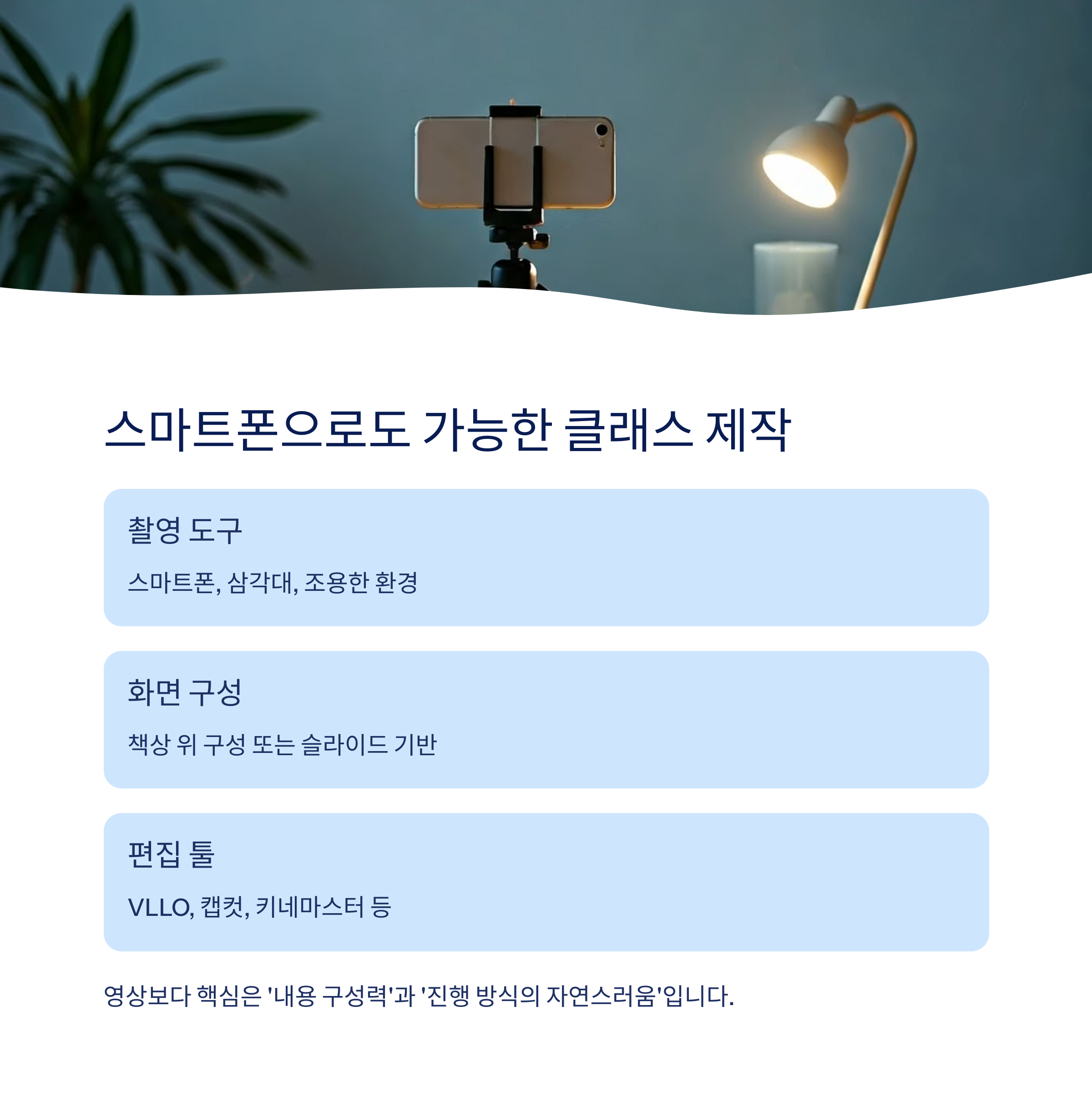 **스마트폰 + 삼각대 + 무료 편집 앱(캡컷 등)**만으로도 충분한 품질의 강의 콘텐츠가 가능합니다.