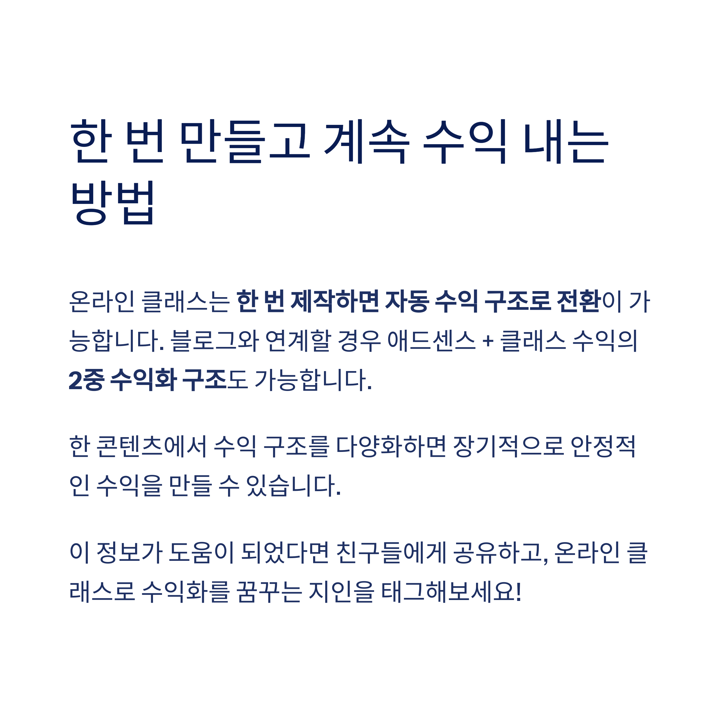 블로그와 연계할 경우 애드센스 + 클래스 수익의 2중 수익화 구조도 가능합니다.