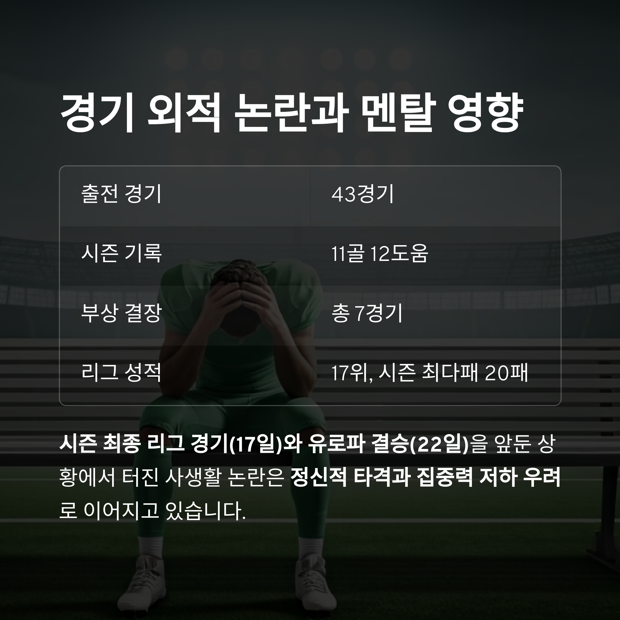 특히 4월 이후 발 부상으로 인해 7경기 연속 결장한 바 있어, 복귀 후 분위기 반전이 절실한 상황이었습니다.