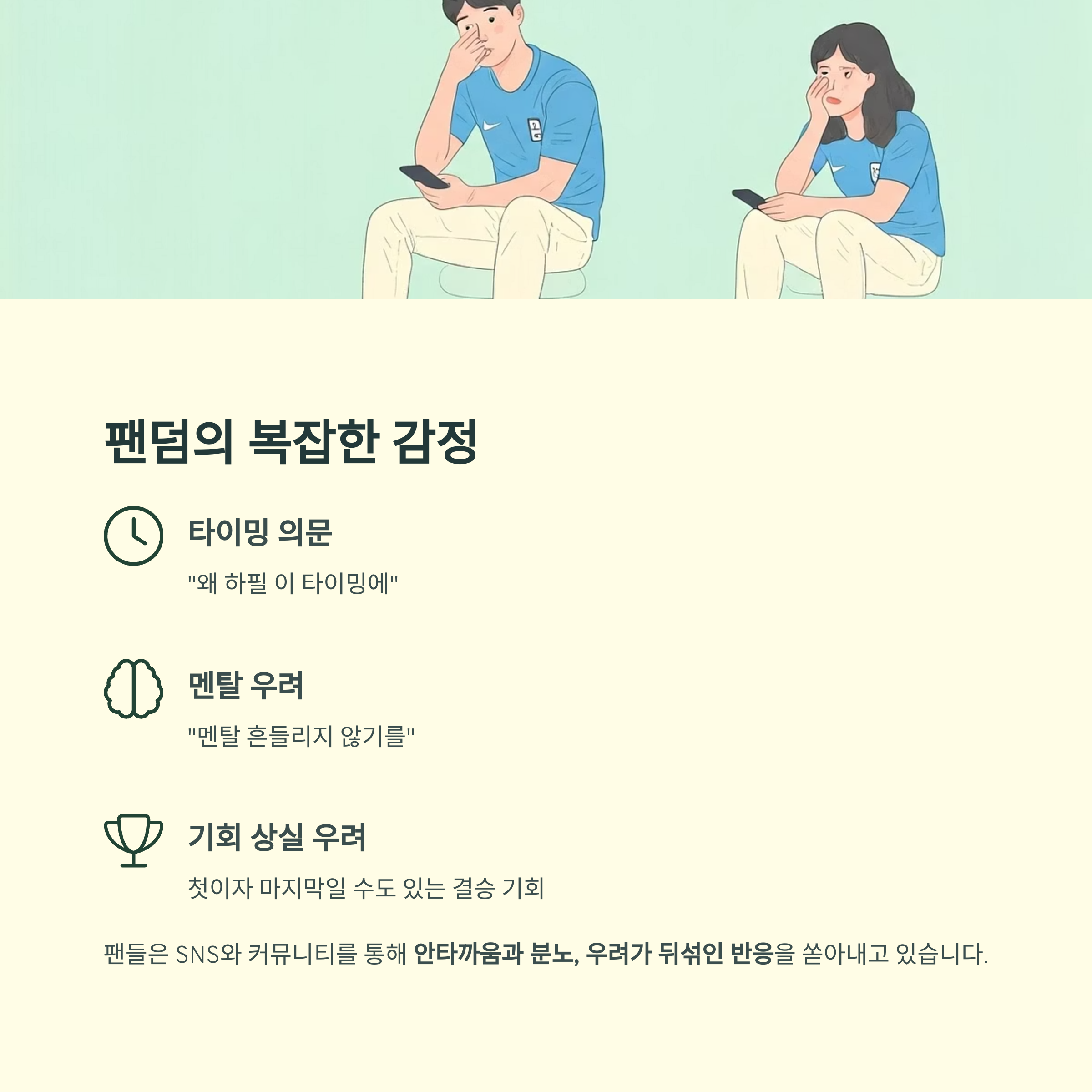 "왜 하필 이 타이밍에", "멘탈 흔들리지 않기를"이라는 반응을 보이며