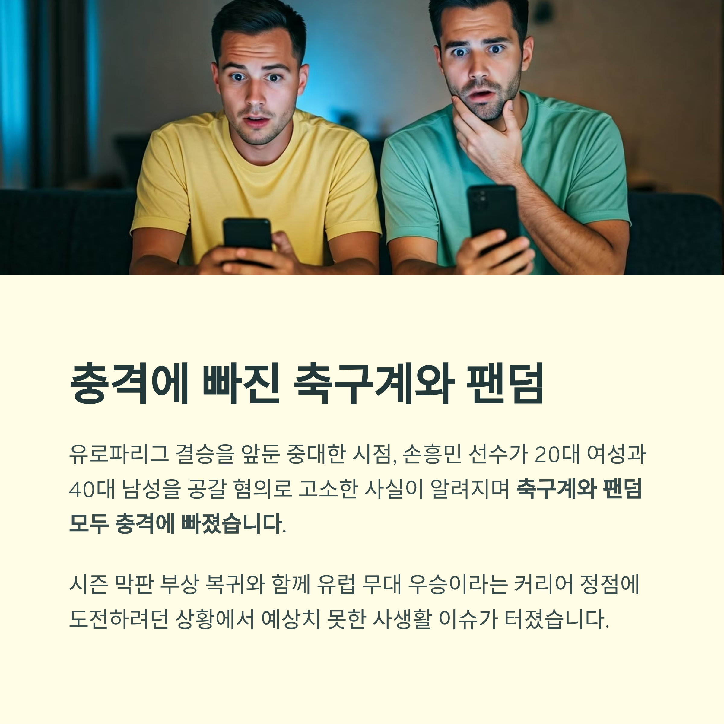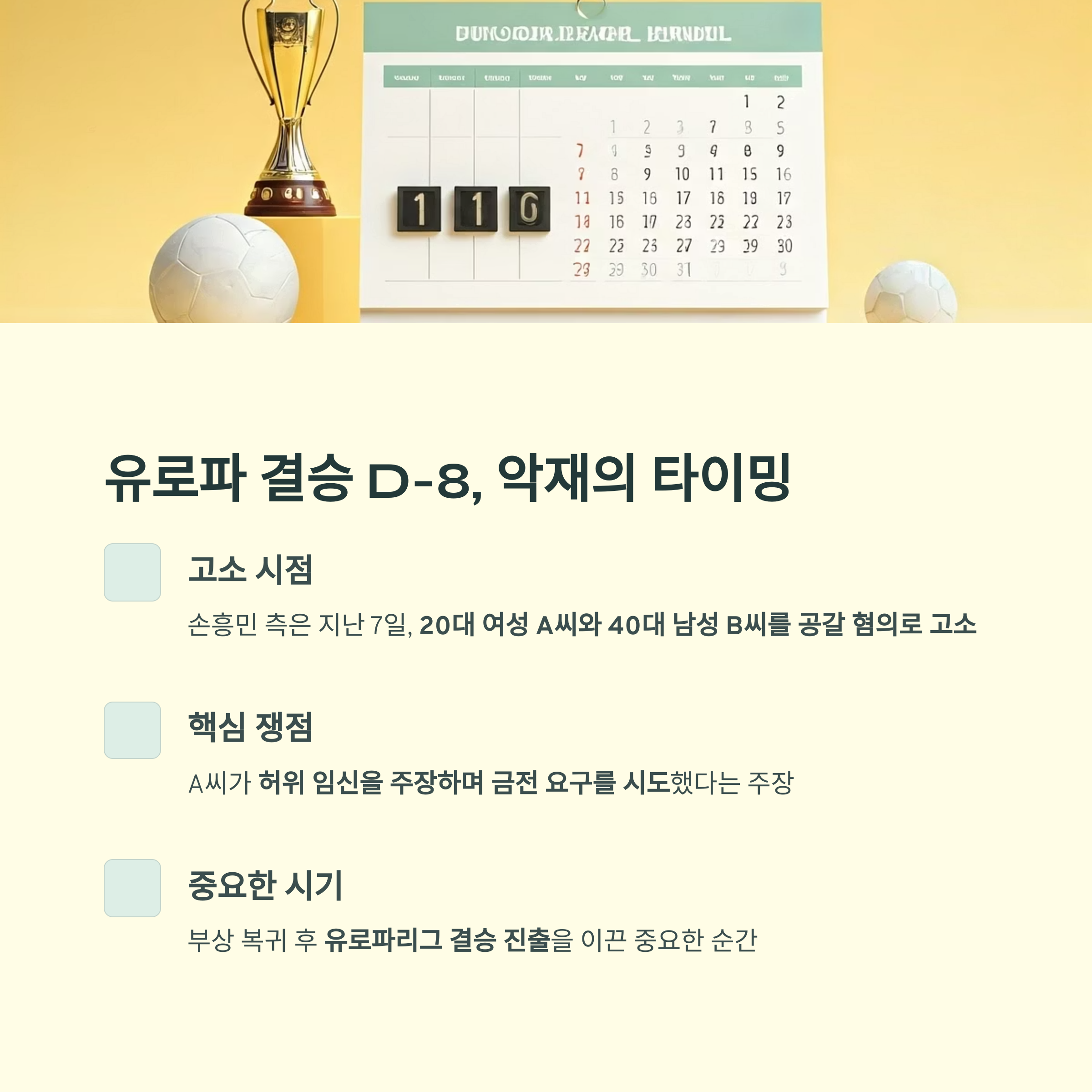유로파리그 결승을 앞둔 중대한 시점, 손흥민 선수가 20대 여성과 40대 남성을 공갈 혐의로 고소한 사실이 알려지며 축구계와 팬덤 모두 충격에 빠졌습니다. 시즌 막판 부상 복귀와 함께 유럽 무대 우승이라는 커리어 정점에 도전하려던 상황에서, 예상치 못한 사생활 이슈가 터지며 여론의 이목이 집중되고 있습니다.