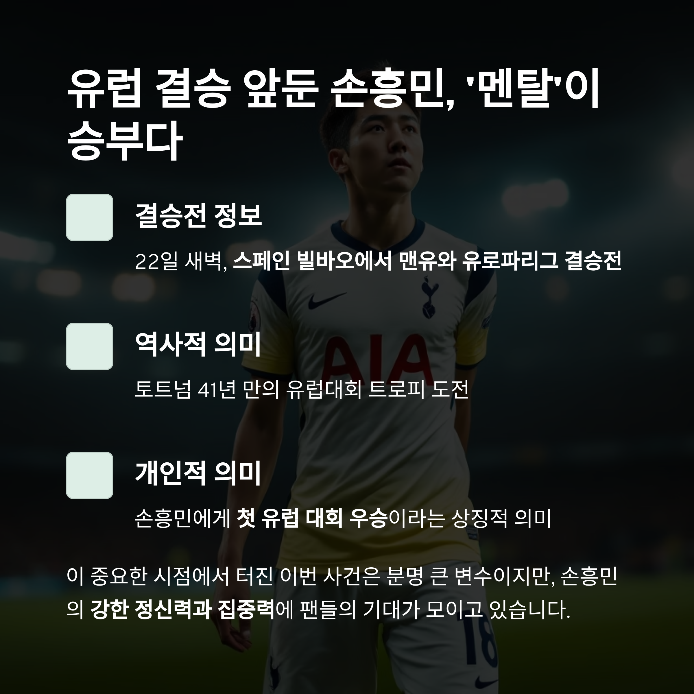 공교롭게도 이 시점은 손흥민이 부상을 털고 복귀해 팀의 유로파리그 결승 진출을 이끌고, 개인 커리어 첫 유럽 대회 우승에 도전하는 중요한 순간입니다.