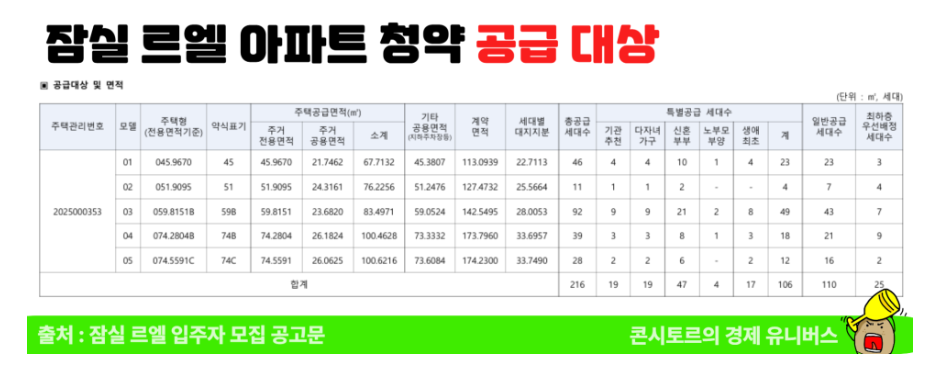잠실 르엘은 총 216세대로 공급됩니다. 타입은 45㎡, 51㎡, 59㎡, 74㎡로 다양하게 구성되어 있으며, 59㎡ 타입이 가장 많은 비중을 차지합니다. 소형부터 중형까지 다양한 선택지가 있지만 공급 물량이 한정적이어서 경쟁률은 상당할 것으로 예상됩니다.