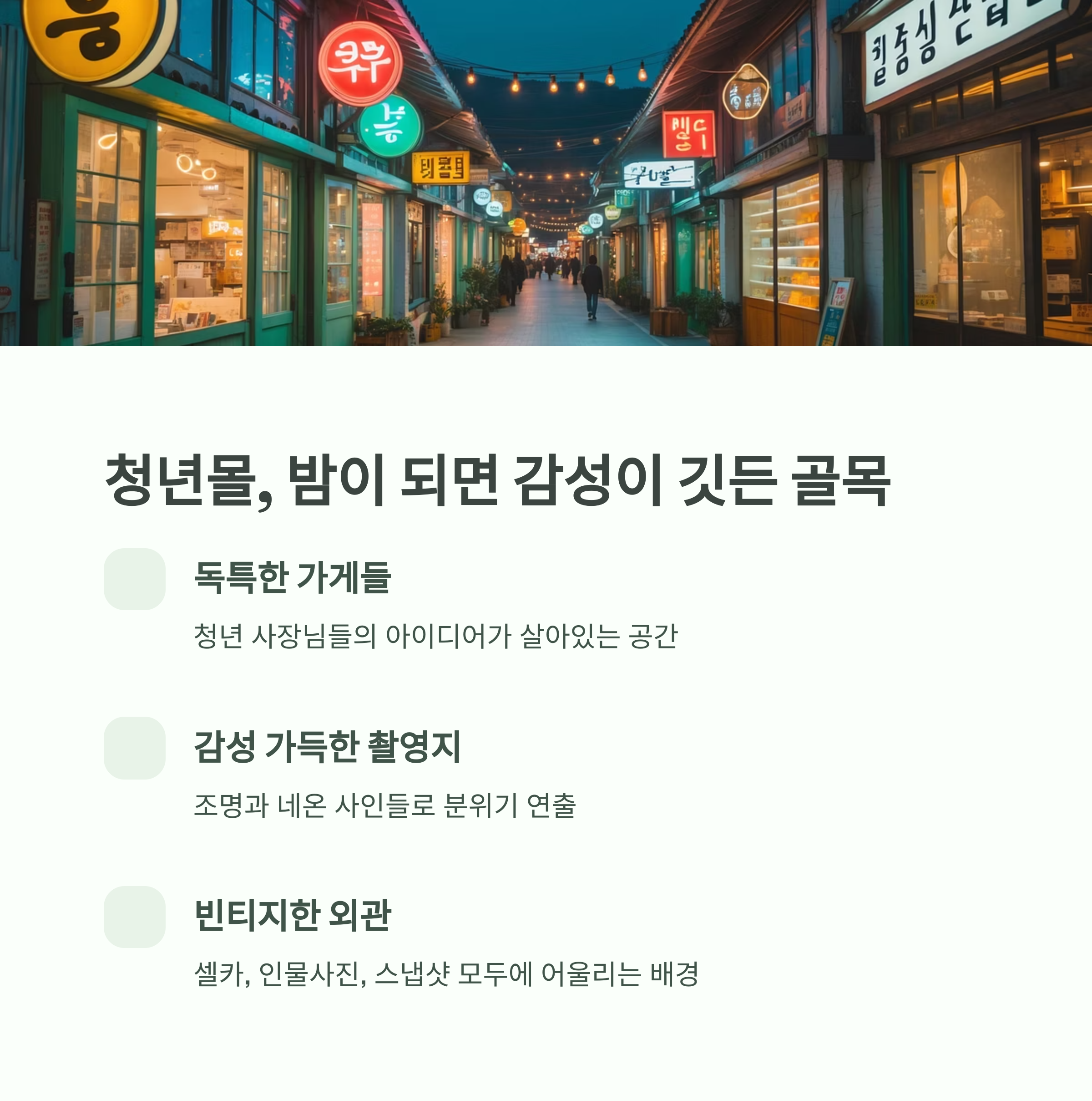 | 청년몰 입구 계단 | 조명 간판 + 벽화 | 인물 전신샷, 셀카 |