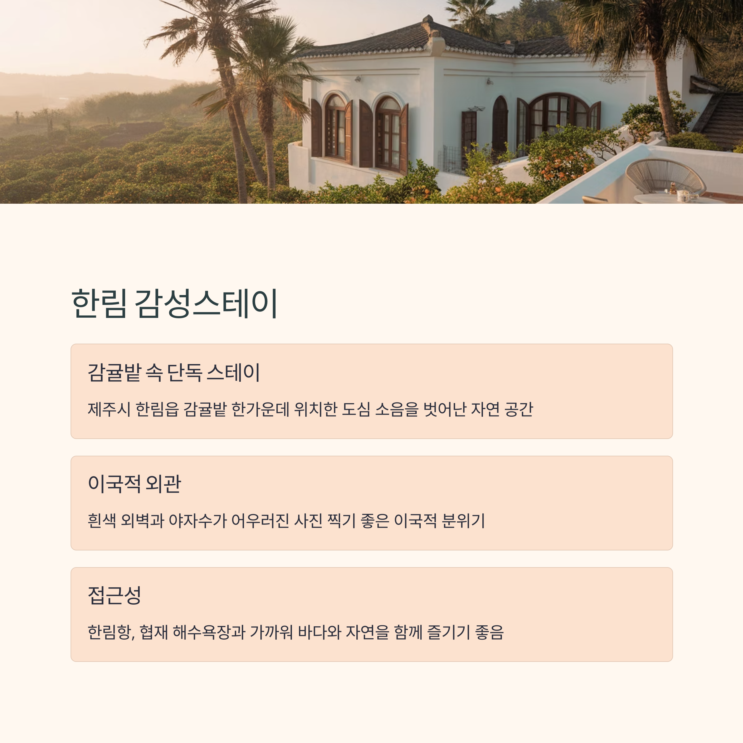 제주시 한림읍 감귤밭 한가운데 있는 이 숙소는 도심의 소음을 벗어나 제주 자연을 만끽할 수 있는 공간입니다.
