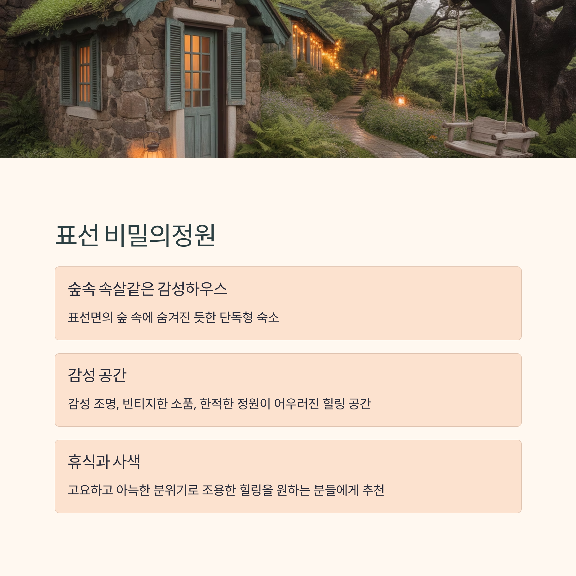 표선면의 비밀의정원은 숲 속에 숨겨진 듯한 단독형 숙소입니다.