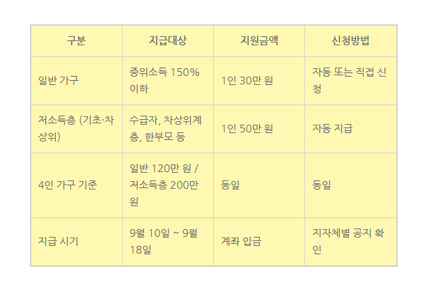 일반 가구는 1인당 30만 원, 4인 가구 기준 120만 원을 받을 수 있습니다. 저소득층은 1인당 50만 원, 4인 가구 기준 200만 원까지 가능하죠. 고소득층 일부를 제외하면 대부분의 가구가 해당된다고 볼 수 있습니다.