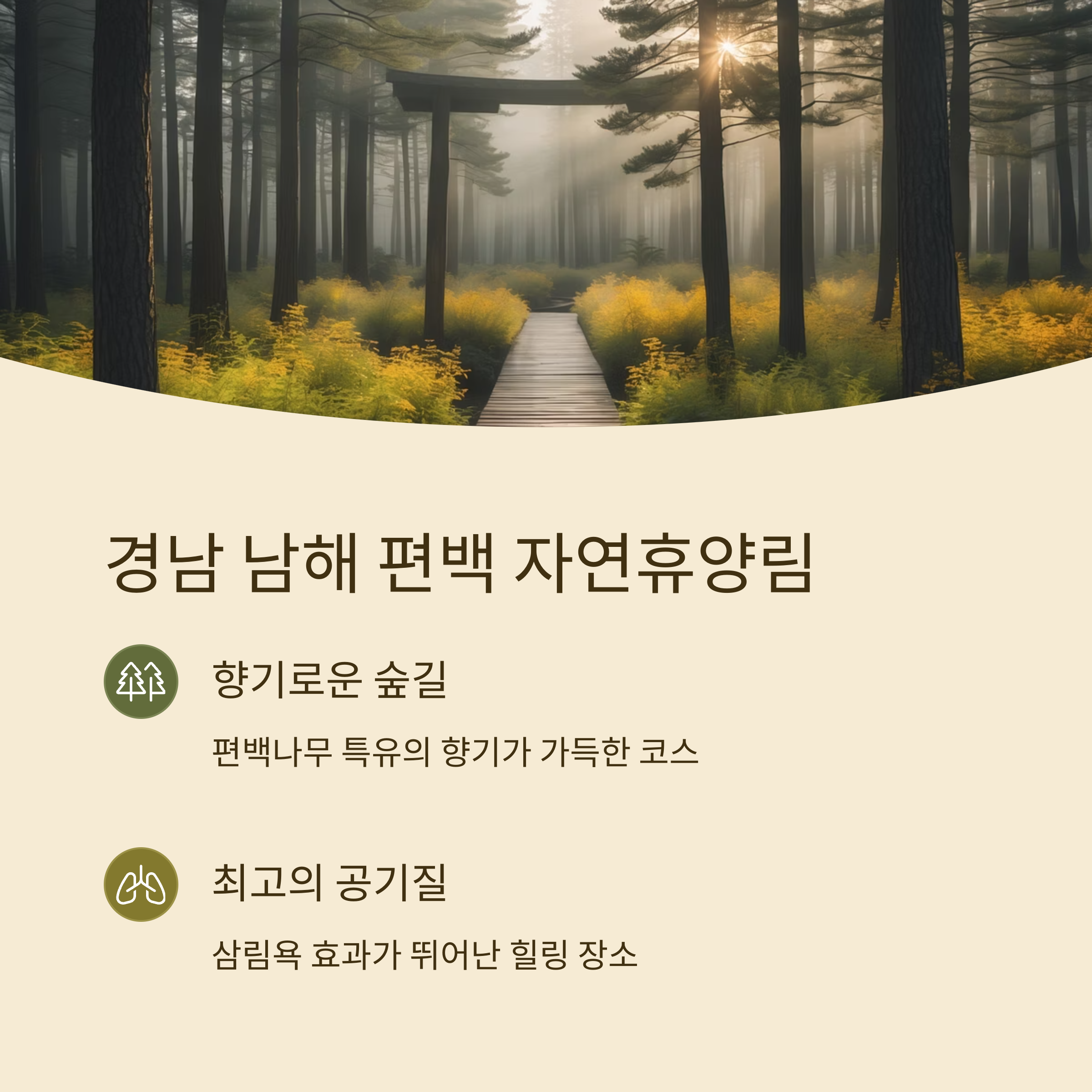 남해의 편백나무숲은 향기로운 숲길과 함께 산책로가 부드럽게 이어져 걷는 내내 편안합니다.