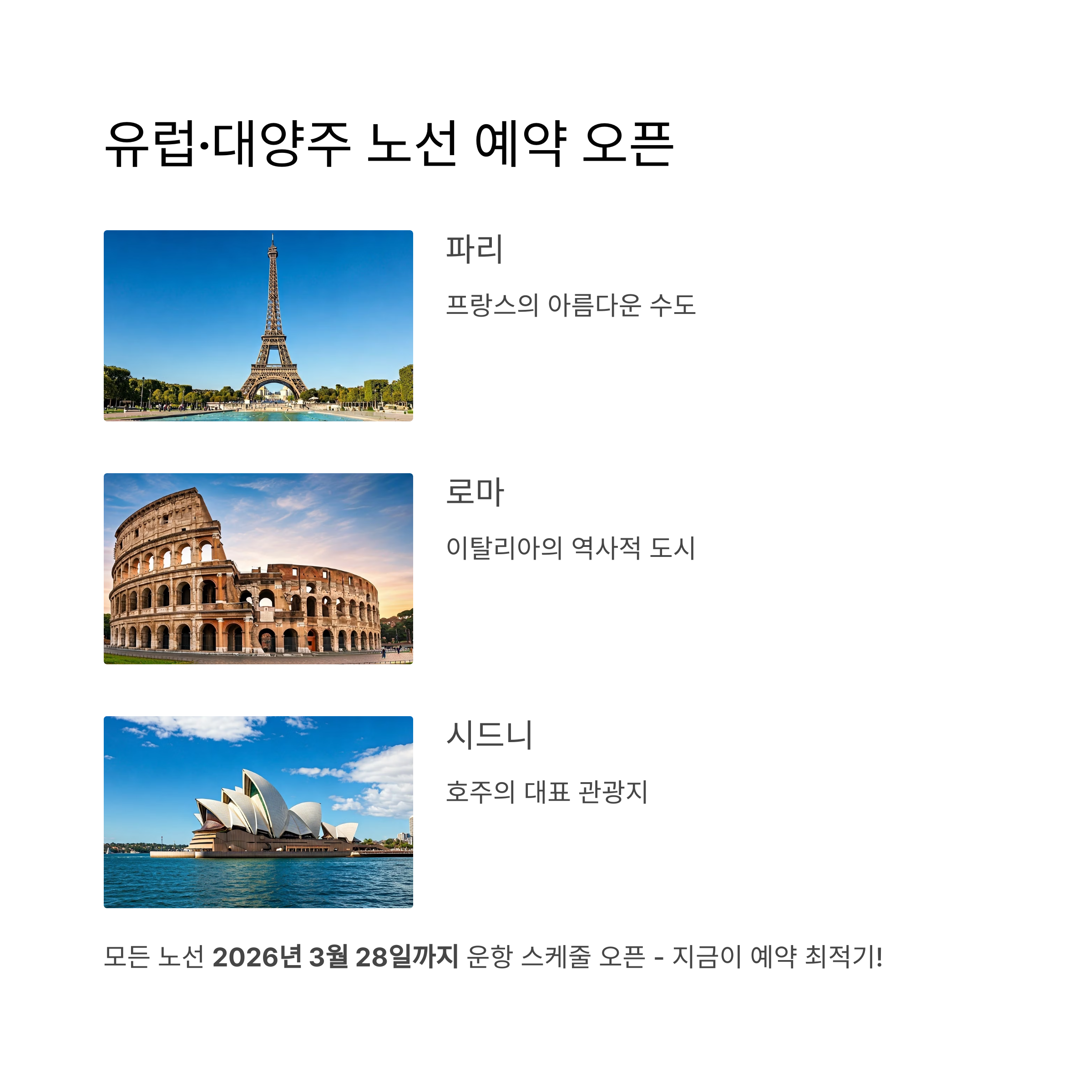 시드니 노선이 있으며, 모두 2026년 3월 28일까지 운항 스케줄이 오픈된 상태입니다.