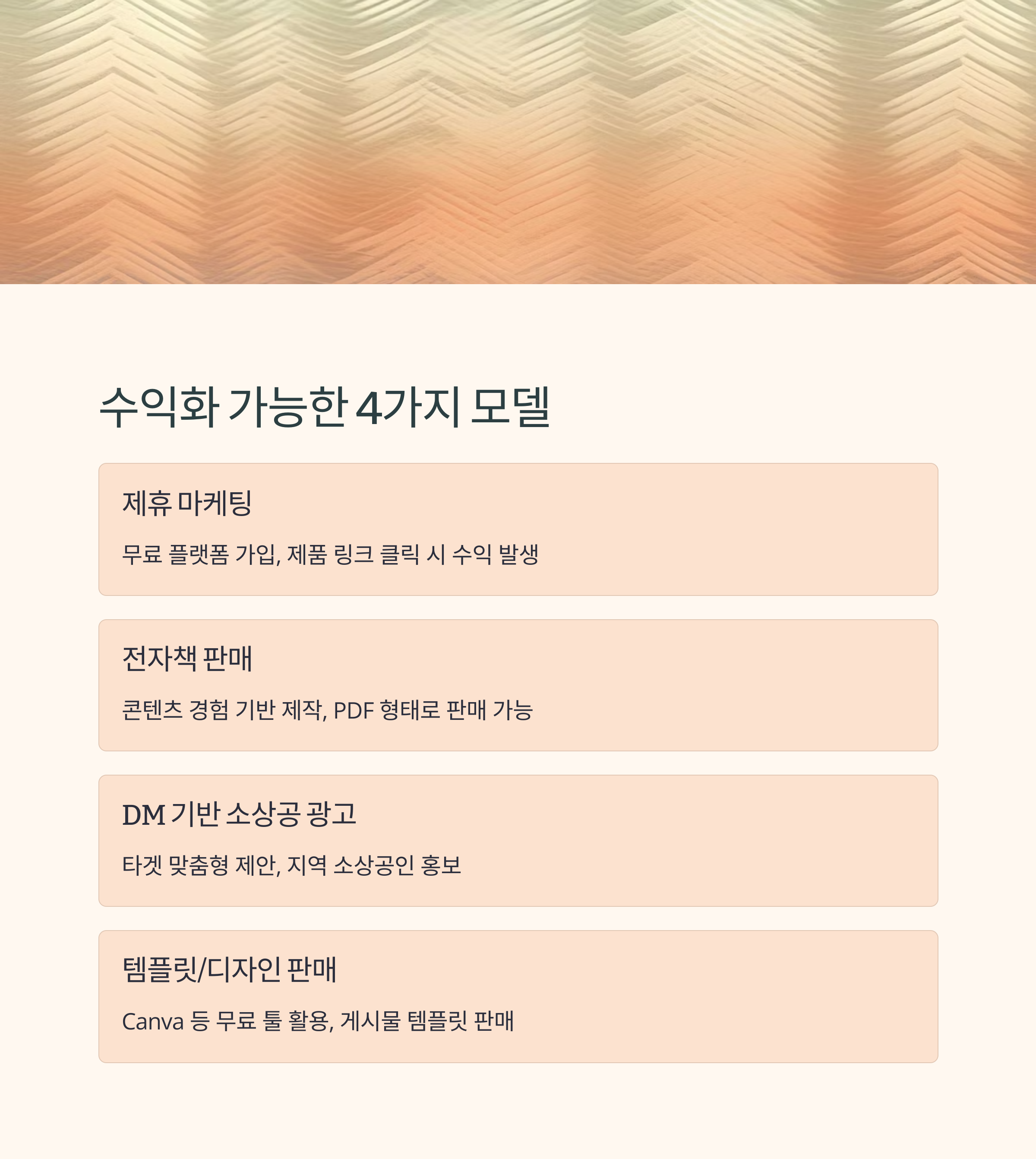 | 템플릿/디자인 판매 | Canva 등 무료 툴 활용 | 게시물 템플릿 판매 가능 |