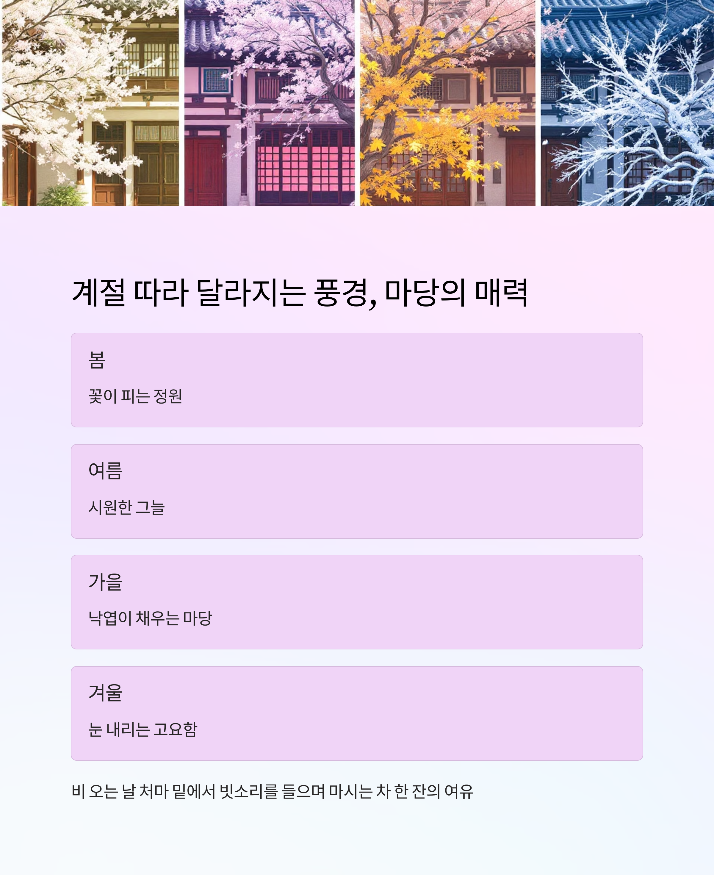 | 사계절 감성 | 마당 풍경, 처마 빗소리, 계절의 변화 경험 |