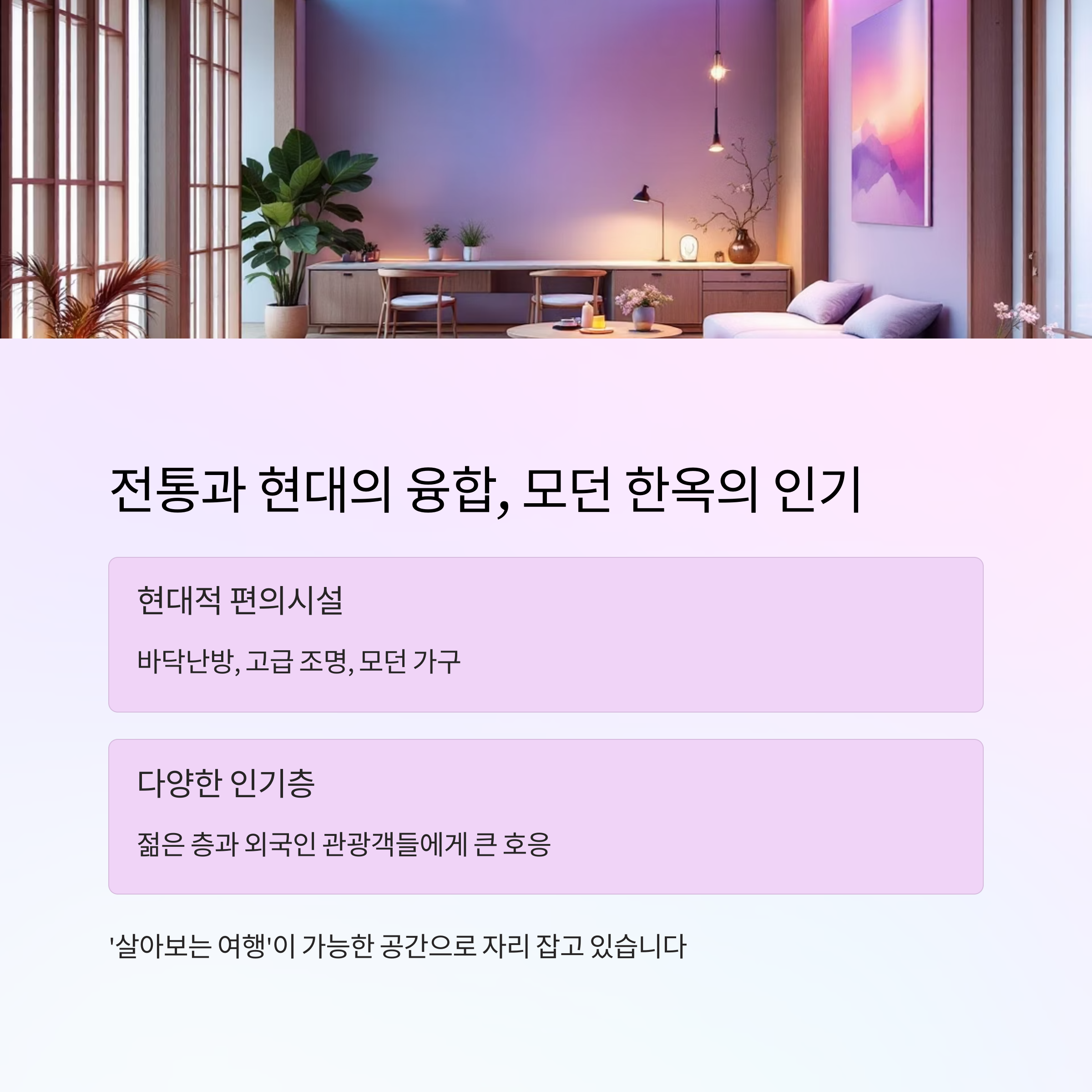 요즘은 현대적인 편의시설을 갖춘 모던 한옥형 숙소도 다양하게 등장하고 있습니다.
