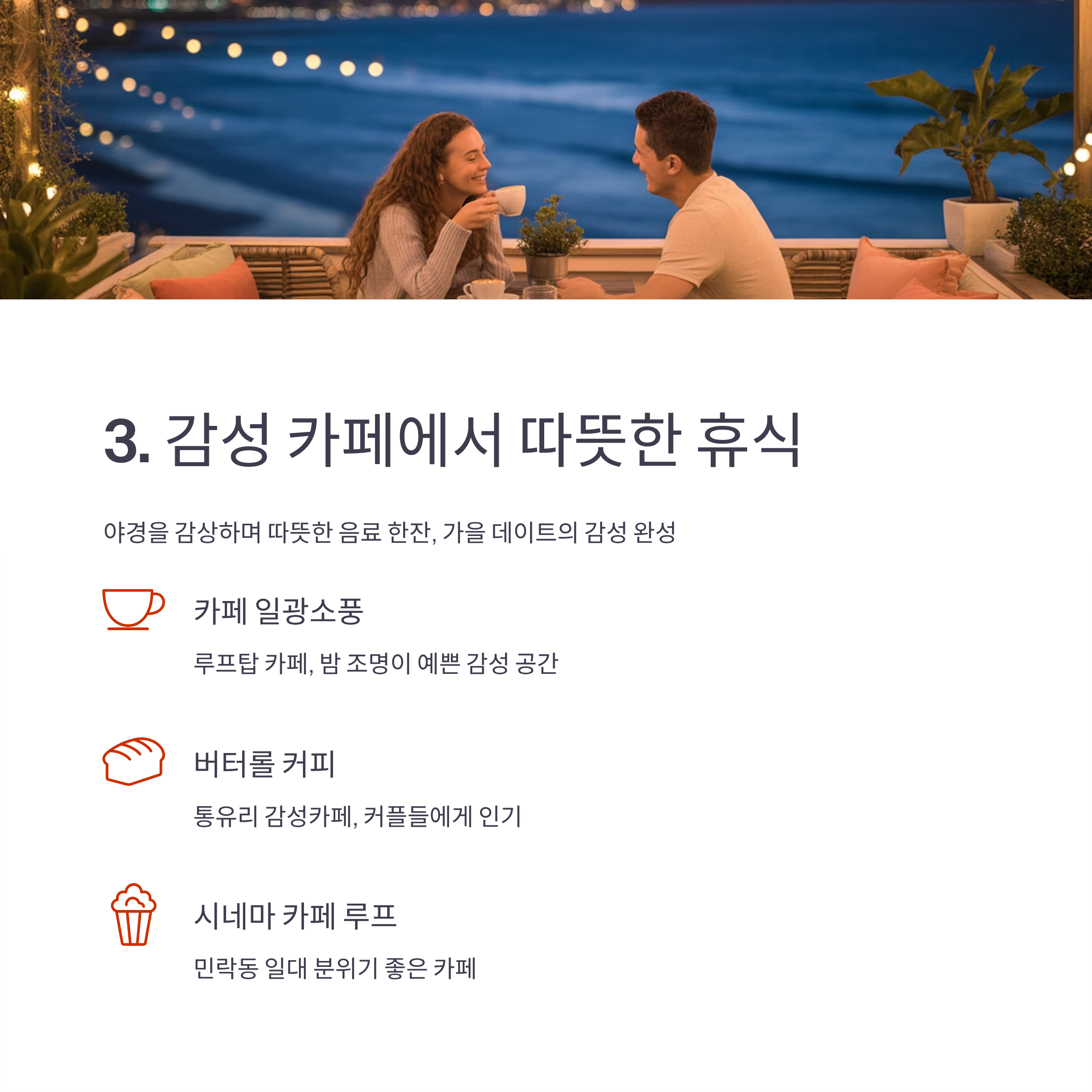 특히 “카페 일광소풍”, “버터롤 커피”, “시네마 카페 루프” 등은 밤에도 조명이 예쁘게 들어와서 커플들에게 인기입니다.