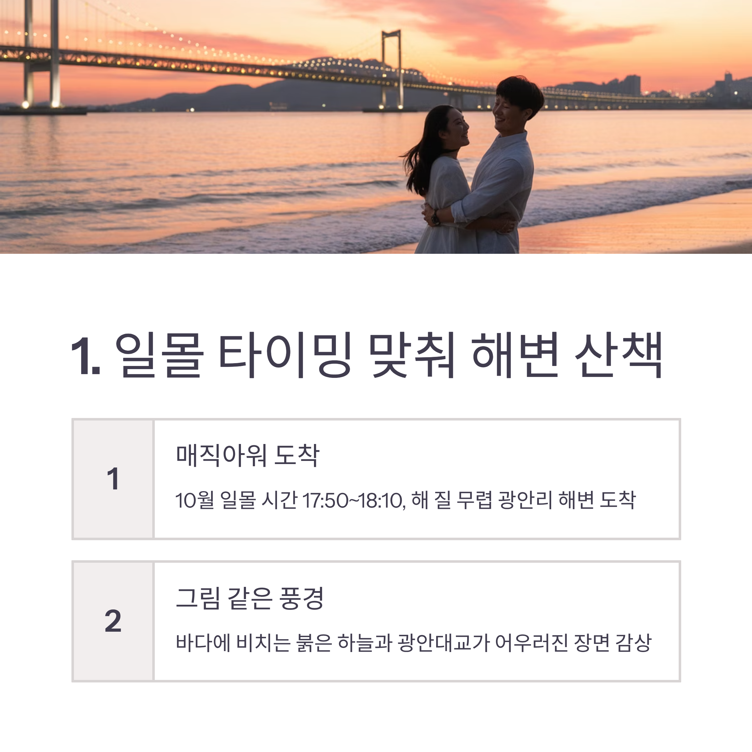 1. 일몰 타이밍 맞춰 광안리 해변 산책 시작