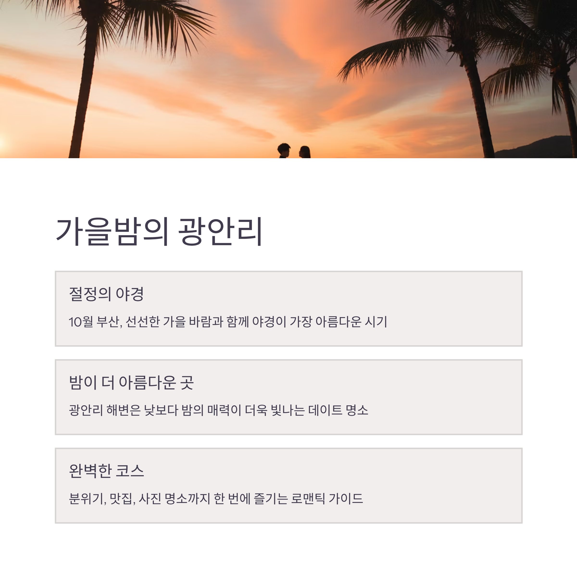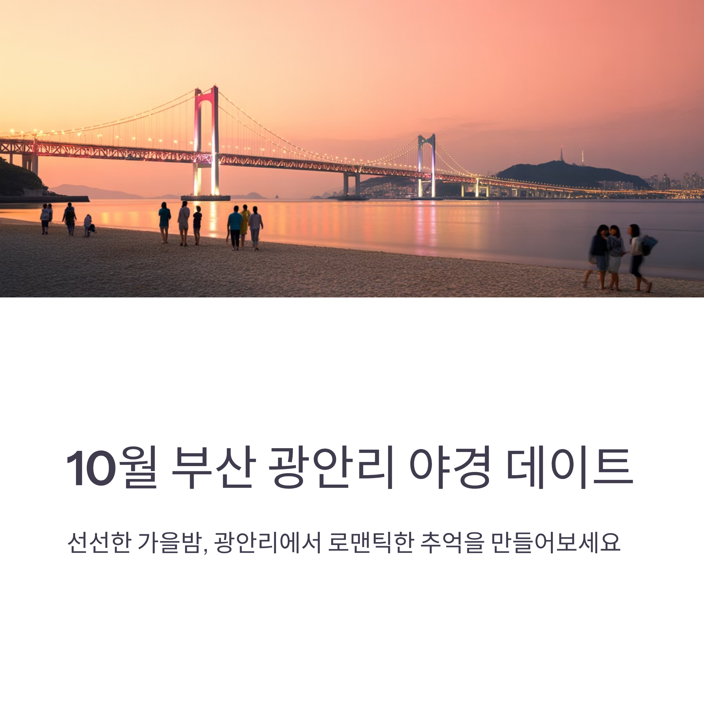 10월의 부산은 선선한 가을 바람과 함께 야경이 절정에 이르는 시기입니다. 특히 광안리 해변은 낮보다 밤이 더 아름답다는 말이 나올 만큼, 야경 데이트 명소로 손꼽히죠. 이번 글에서는 커플이라면 놓치지 말아야 할 광안리 야경 데이트 코스를 순서대로 소개해드릴게요. 분위기, 맛집, 사진 명소까지 한 번에 정리했습니다.