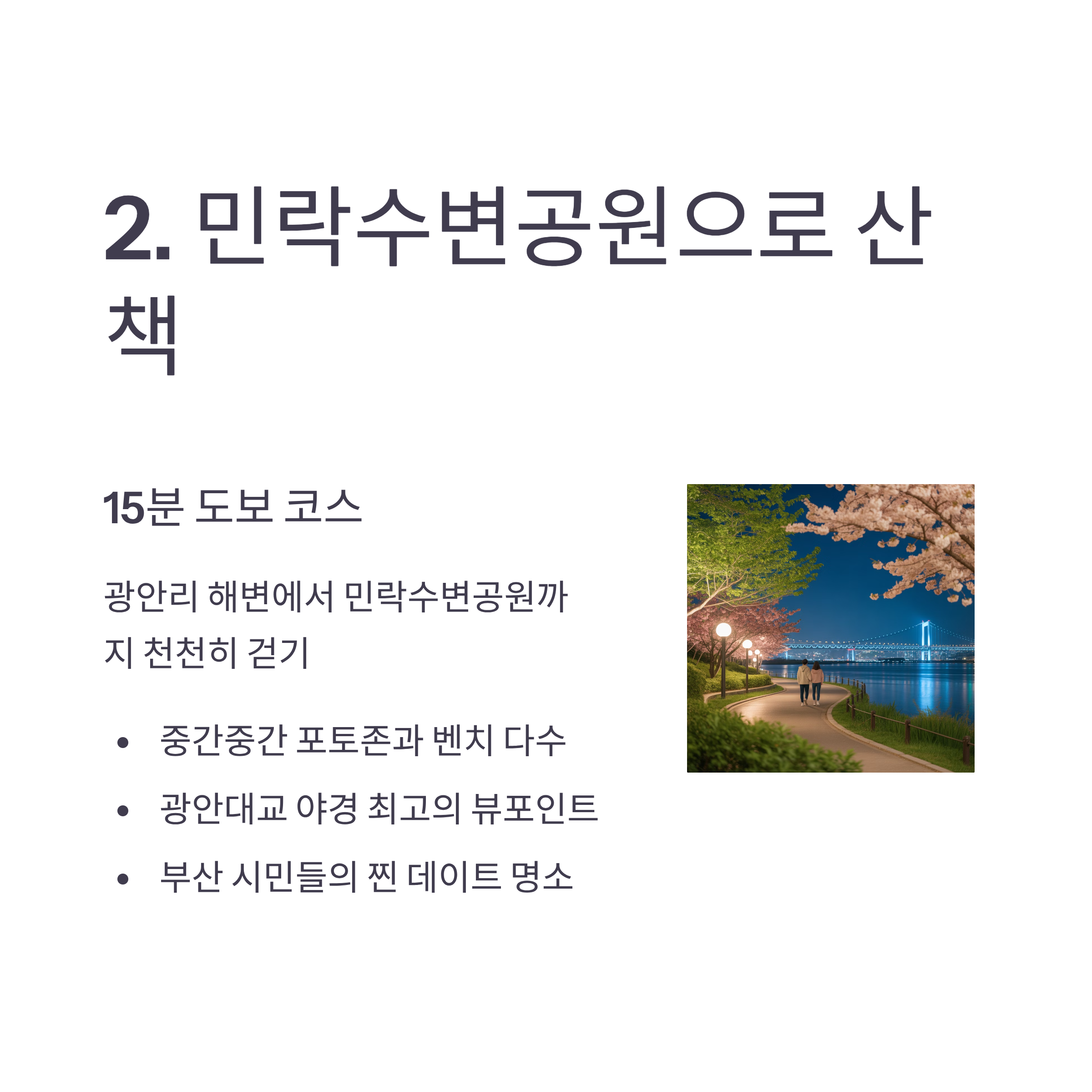 | 18:10~18:30 | 민락수변공원 이동 | 포토존 감상, 벤치 데이트 |
