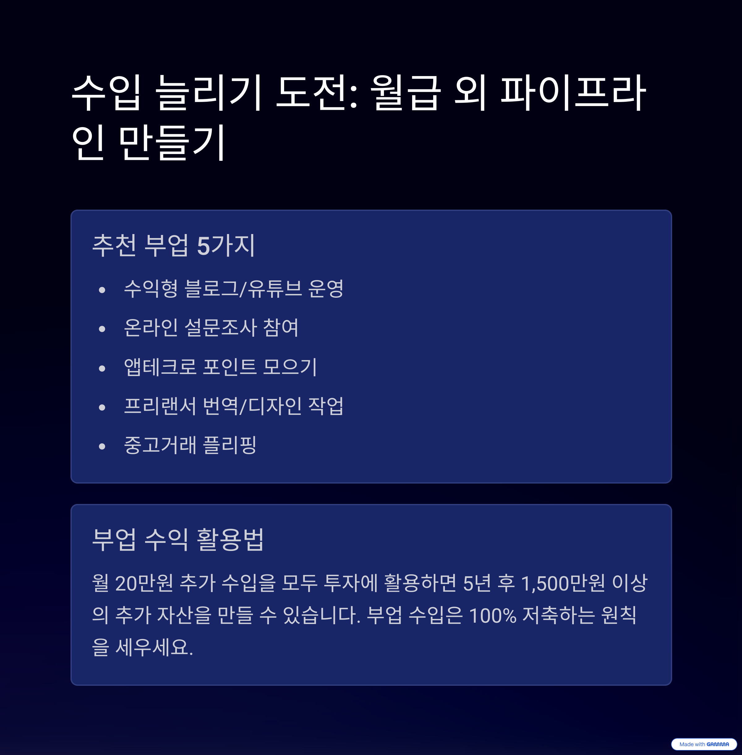 - 부수입을 만들어 종잣돈을 빠르게 모은다.
