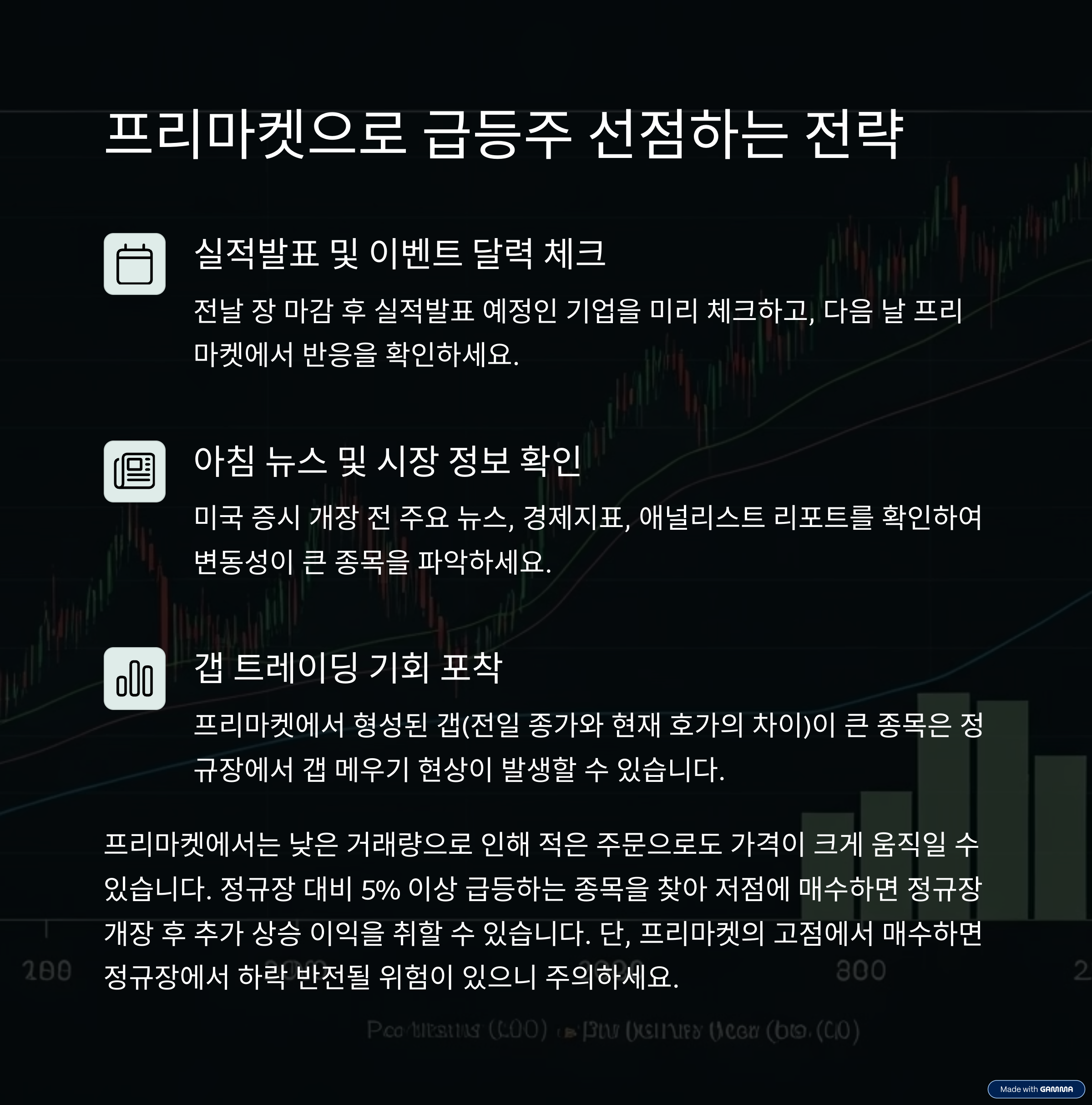 - 프리마켓 거래량이 급증하는 종목을 주목하세요.