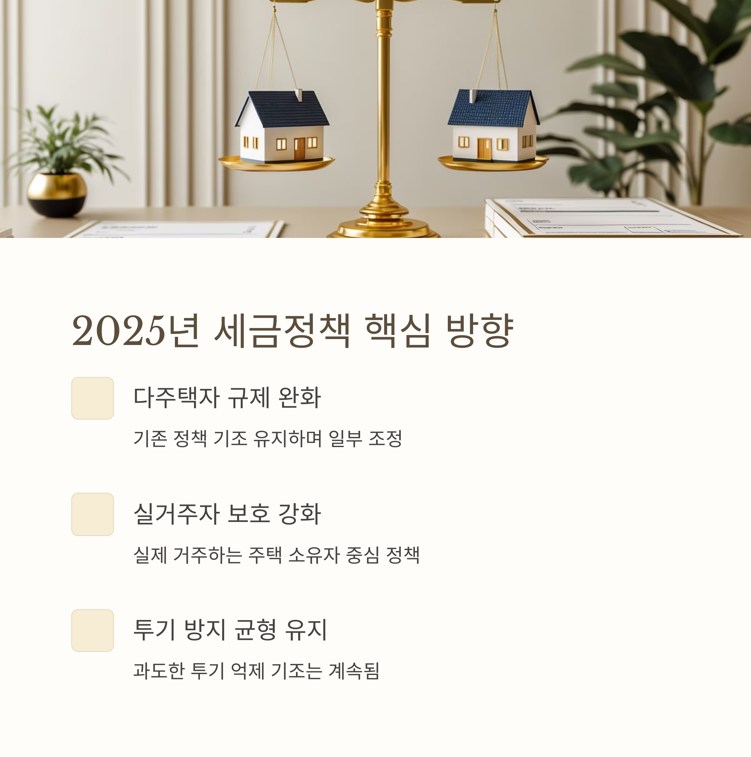2025년부터 시행되는 부동산 세금정책은 다주택자 규제 완화 기조가 유지되면서도, 실거주자 보호와 투기 방지의 균형을 맞추는 방향으로 설계되고 있습니다.