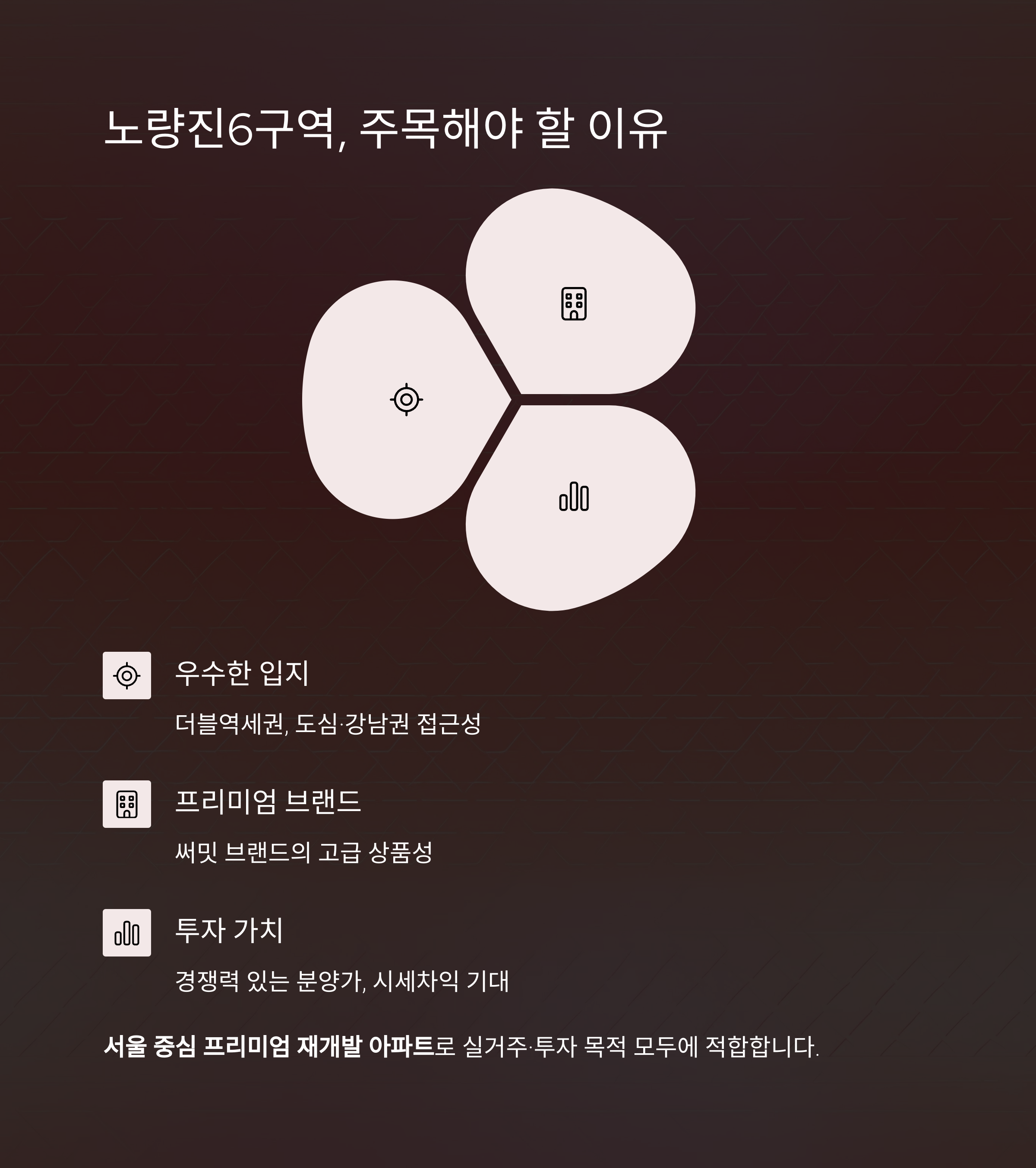노량진6구역은 입지, 브랜드, 분양가 세 요소 모두에서 경쟁력을 갖춘 단지입니다.