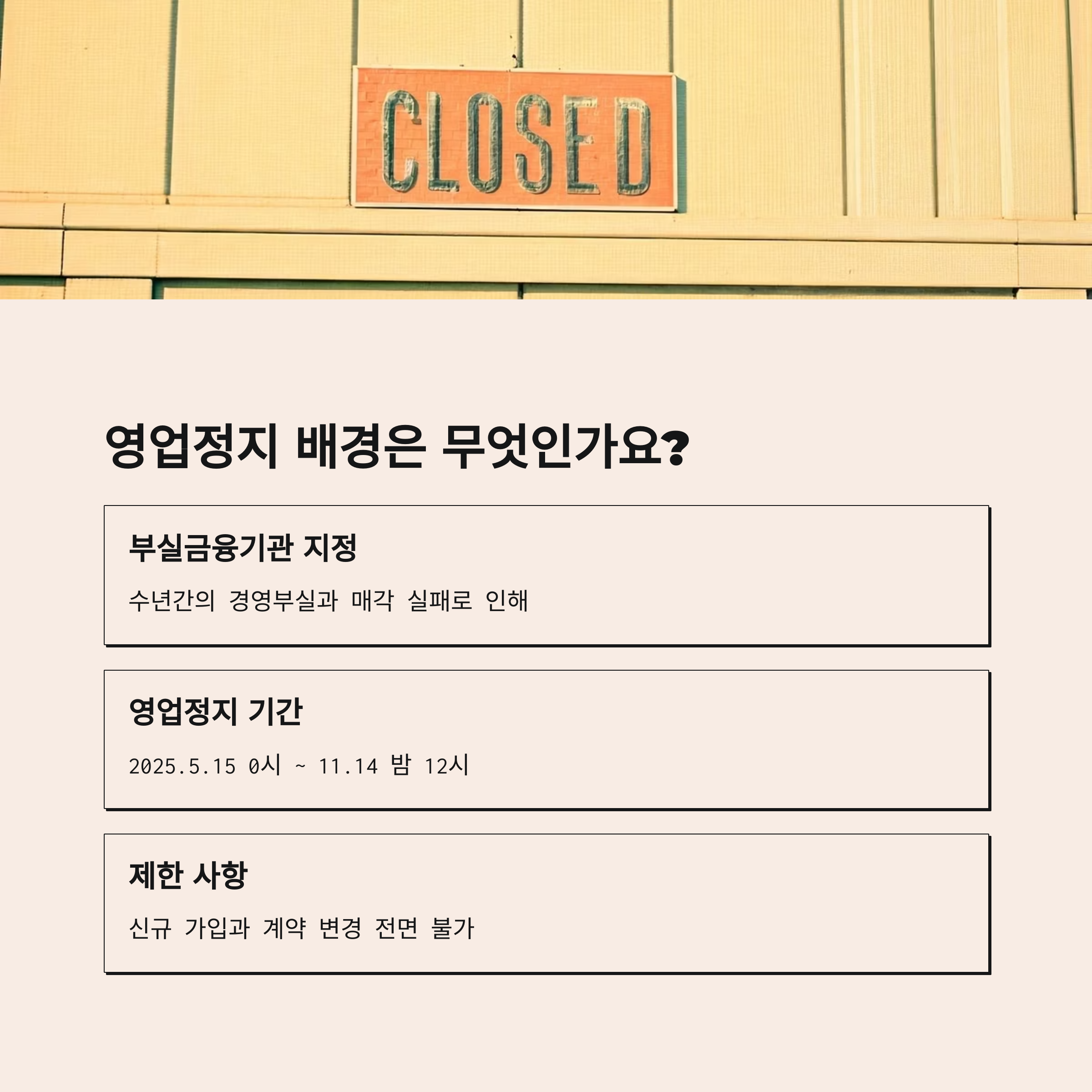 | 2025.05.15 | 영업정지 개시, 가교보험사 운영 시작 |